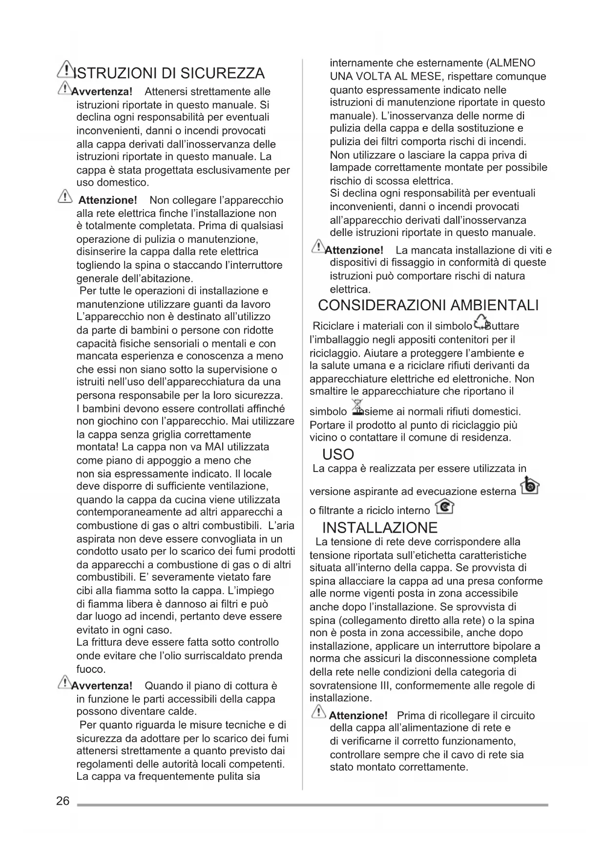 Avvertenza! Attenersi strettamente alle istruzioni riportate in questo manuale. Si declina ogni responsabilità per eventuali inconvenienti, danni o incendi provocati alla cappa derivati dall’inosservanza delle istruzioni riportate in questo manuale. La cappa è stata progettata esclusivamente per uso domestico. Attenzione! Non collegare l’apparecchio alla rete elettrica finche l’installazione non è totalmente completata. Prima di qualsiasi operazione di pulizia o manutenzione, disinserire la cappa dalla rete elettrica togliendo la spina o staccando l’interruttore generale dell’abitazione. Per tutte le operazioni di installazione e manutenzione utilizzare guanti da lavoro L’apparecchio non è destinato all’utilizzo da parte di bambini o persone con ridotte capacità fisiche sensoriali o mentali e con mancata esperienza e conoscenza a meno che essi non siano sotto la supervisione o istruiti nell’uso dell’apparecchiatura da una persona responsabile per la loro sicurezza. I bambini devono essere controllati affinché non giochino con l’apparecchio. Mai utilizzare la cappa senza griglia correttamente montata! La cappa non va MAI utilizzata come piano di appoggio a meno che non sia espressamente indicato. Il locale deve disporre di sufficiente ventilazione, quando la cappa da cucina viene utilizzata contemporaneamente ad altri apparecchi a combustione di gas o altri combustibili. L’aria aspirata non deve essere convogliata in un condotto usato per lo scarico dei fumi prodotti da apparecchi a combustione di gas o di altri combustibili. E’ severamente vietato fare cibi alla fiamma sotto la cappa. L’impiego di fiamma libera è dannoso ai filtri e può dar luogo ad incendi, pertanto deve essere evitato in ogni caso. La frittura deve essere fatta sotto controllo onde evitare che l’olio surriscaldato prenda fuoco. Avvertenza! Quando il piano di cottura è in funzione le parti accessibili della cappa possono diventare calde. Per quanto riguarda le misure tecniche e di sicurezza da adottare per lo scarico dei fumi attenersi strettamente a quanto previsto dai regolamenti delle autorità locali competenti. La cappa va frequentemente pulita sia internamente che esternamente (ALMENO UNA VOLTA AL MESE, rispettare comunque quanto espressamente indicato nelle istruzioni di manutenzione riportate in questo manuale). L’inosservanza delle norme di pulizia della cappa e della sostituzione e pulizia dei filtri comporta rischi di incendi. Non utilizzare o lasciare la cappa priva di lampade correttamente montate per possibile rischio di scossa elettrica. Si declina ogni responsabilità per eventuali inconvenienti, danni o incendi provocati all’apparecchio derivati dall’inosservanza delle istruzioni riportate in questo manuale. Attenzione! La mancata installazione di viti e dispositivi di fissaggio in conformità di queste istruzioni può comportare rischi di natura elettrica. CONSIDERAZIONI AMBIENTALI Riciclare i materiali con il simbolo . Buttare l’imballaggio negli appositi contenitori per il riciclaggio. Aiutare a proteggere l’ambiente e la salute umana e a riciclare rifiuti derivanti da apparecchiature elettriche ed elettroniche. Non smaltire le apparecchiature che riportano il simbolo insieme ai normali rifiuti domestici. Portare il prodotto al punto di riciclaggio più vicino o contattare il comune di residenza. USO La cappa è realizzata per essere utilizzata in versione aspirante ad evecuazione esterna o filtrante a riciclo interno . INSTALLAZIONE La tensione di rete deve corrispondere alla tensione riportata sull’etichetta caratteristiche situata all’interno della cappa. Se provvista di spina allacciare la cappa ad una presa conforme alle norme vigenti posta in zona accessibile anche dopo l’installazione. Se sprovvista di spina (collegamento diretto alla rete) o la spina non è posta in zona accessibile, anche dopo installazione, applicare un interruttore bipolare a norma che assicuri la disconnessione completa della rete nelle condizioni della categoria di sovratensione III, conformemente alle regole di installazione. Attenzione! Prima di ricollegare il circuito della cappa all’alimentazione di rete e di verificarne il corretto funzionamento, controllare sempre che il cavo di rete sia stato montato correttamente.27 La distanza minima fra la superficie di supporto dei recipienti sul dispositivo di cottura e la parte più bassa della cappa da cucina deve essere non inferiore a 50cm in caso di cucine elettriche e di 65cm in caso di cucine a gas o miste. Se le istruzioni di installazione del dispositivo di cottura a gas specificano una distanza maggiore, bisogna tenerne conto. MANUTENZIONE Attenzione! Prima di qualsiasi operazione di pulizia o manutenzione, disinserire la cappa dalla rete elettrica togliendo la spina o staccando l’interruttore generale dell’abitazione. La cappa va frequentemente pulita (almeno con la stessa frequenza con cui si esegue la manutenzione dei filtri grassi), sia internamente che esternamente. Per la pulizia usare un panno inumidito con detersivi liquidi neutri. Evitare l’uso di prodotti contenenti abrasivi. NON UTILIZZARE ALCOOL! Attenzione! L’inosservanza delle norme di pulizia dell’apparecchio e della sostituzione dei filtri comporta rischi di incendi. Si raccomanda quindi di attenersi alle istruzioni suggerite. Si declina ogni responsabilità per eventuali danni al motore, incendi provocati da un’impropria manutenzione o dall’inosservanza delle suddette avvertenze. Filtro antigrasso - Il filtro antigrasso deve essere pulito una volta al mese con detergenti non aggressivi, manualmente oppure in lavastoviglie a basse temperature ed a ciclo breve. Con il lavaggio in lavastoviglie il filtro antigrasso può scolorirsi ma le sue caratteristiche di filtraggio non cambiano assolutamente. Type 20 LONG LIFE - Filtro ai carboni attivi lavabile Il filtro al carbone può essere lavato ogni due mesi in acqua calda e detergenti ido