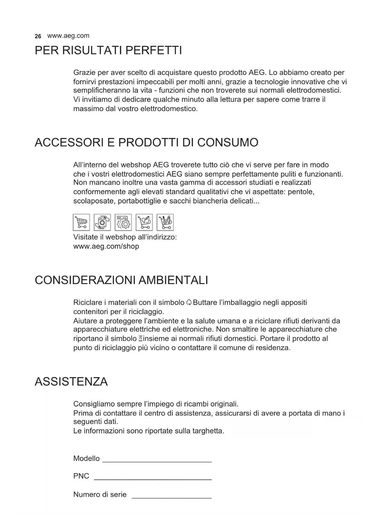 All’interno del webshop AEG troverete tutto ciò che vi serve per fare in modo che i vostri elettrodomestici AEG siano sempre perfettamente puliti e funzionanti. Non mancano inoltre una vasta gamma di accessori studiati e realizzati conformemente agli elevati standard qualitativi che vi aspettate: pentole, scolaposate, portabottiglie e sacchi biancheria delicati... Visitate il webshop all’indirizzo: www.aeg.com/shop CONSIDERAZIONI AMBIENTALI Riciclare i materiali con il simbolo . Buttare l’imballaggio negli appositi contenitori per il riciclaggio. Aiutare a proteggere l’ambiente e la salute umana e a riciclare riuti derivanti da apparecchiature elettriche ed elettroniche. Non smaltire le apparecchiature che riportano il simbolo insieme ai normali riuti domestici. Portare il prodotto al punto di riciclaggio più vicino o contattare il comune di residenza. ASSISTENZA Consigliamo sempre l’impiego di ricambi originali. Prima di contattare il centro di assistenza, assicurarsi di avere a portata di mano i seguenti dati. Le informazioni sono riportate sulla targhetta. Modello __________________________ PNC ____________________________ Numero di serie ___________________27 ITALIAN