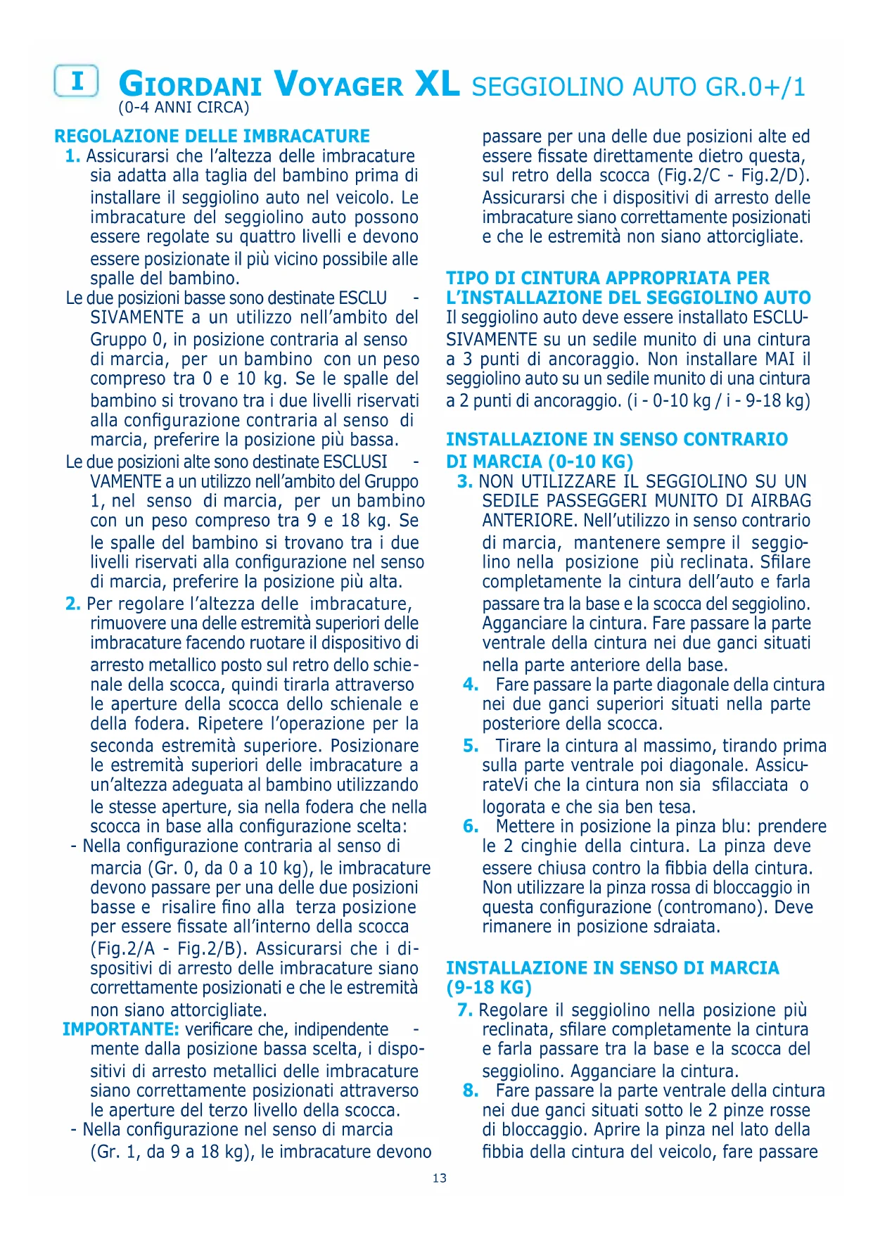 Scarica le istruzioni per il tuo Seggiolino auto in formato PDF gratuitamente! Trova il tuo manuale Voyager XL - Giordani e riprendi in mano il tuo dispositivo elettronico. In questa pagina sono pubblicati tutti i documenti necessari per l'utilizzo del tuo dispositivo. Voyager XL del marchio Giordani.