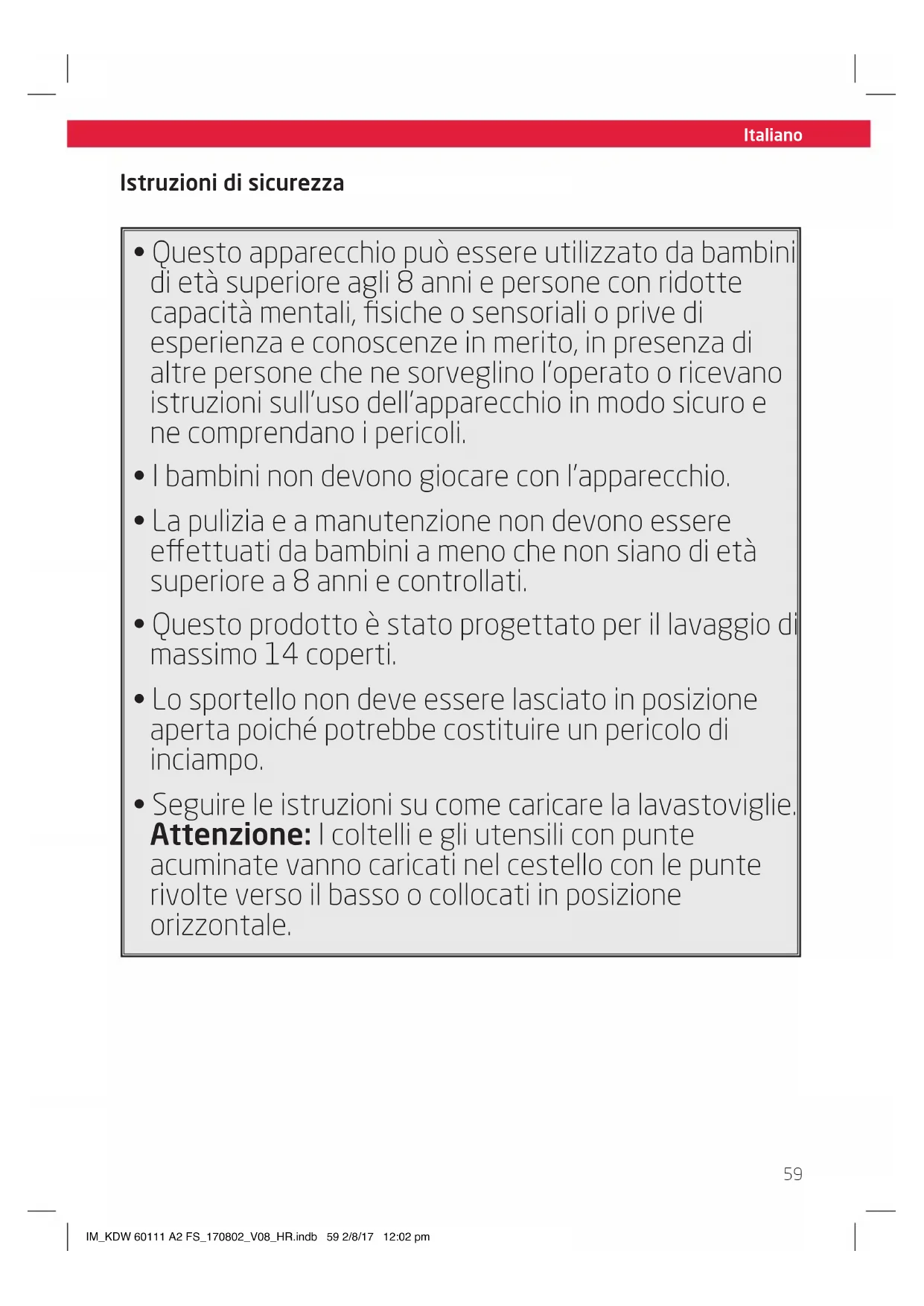 - Seguire le istruzioni su come caricare la lavastoviglie. Attenzione: I coltelli e gli utensili con punte acuminate vanno caricati nel cestello con le punte rivolte verso il basso o collocati in posizione orizzontale. IM_KDW 60111 A2 FS_170802_V08_HR.indb 59 2/8/17 12:02 pmItaliano