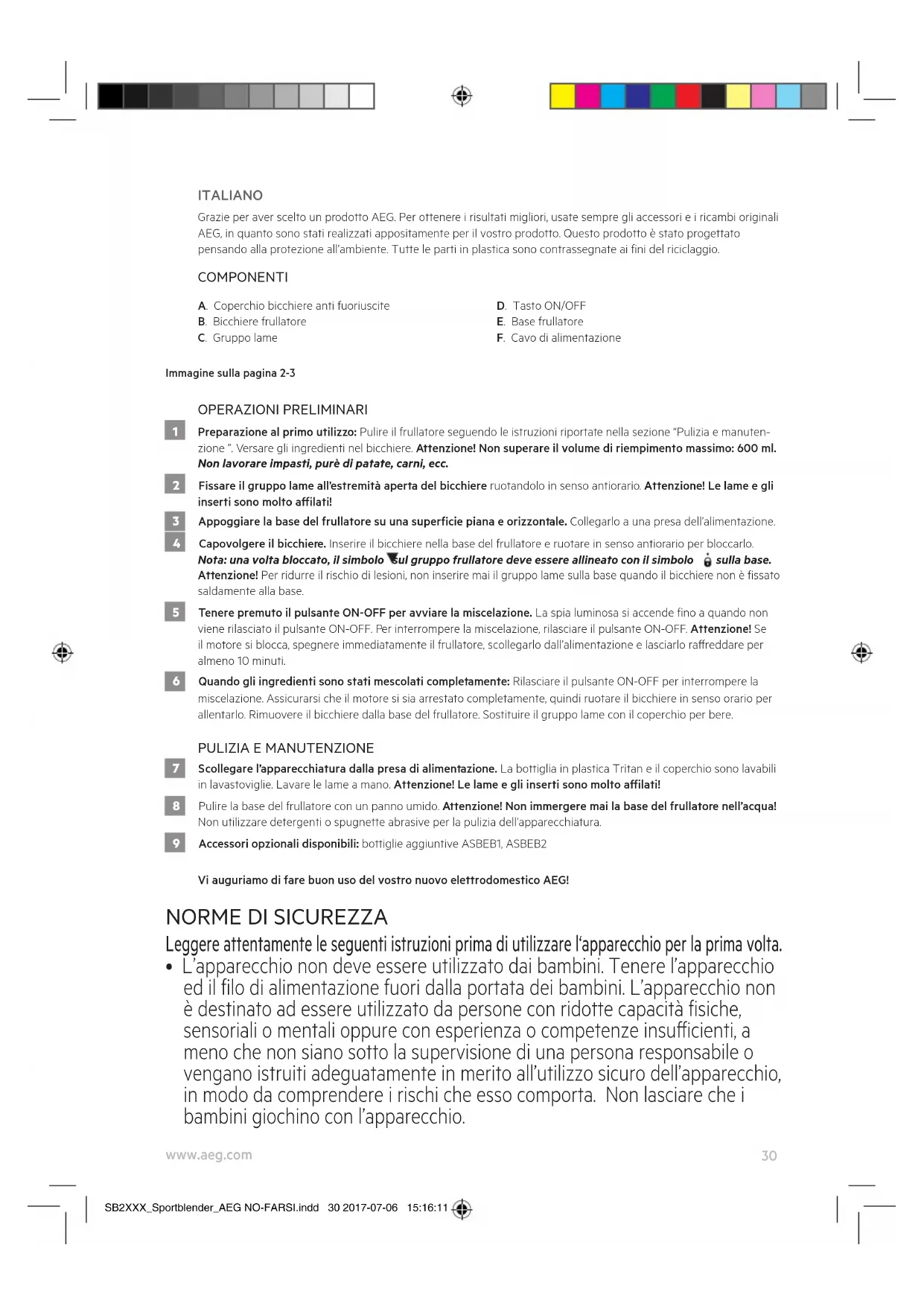- Questo apparecchio è concepito esclusivamente per uso domestico. Il produttore declina qualsiasi responsabilità per eventuali danni causati da uso improprio o non corretto. SB2XXX_Sportblender_AEG NO-FARSI.indd 31 2017-07-06 15:16:1132 www.aeg.com