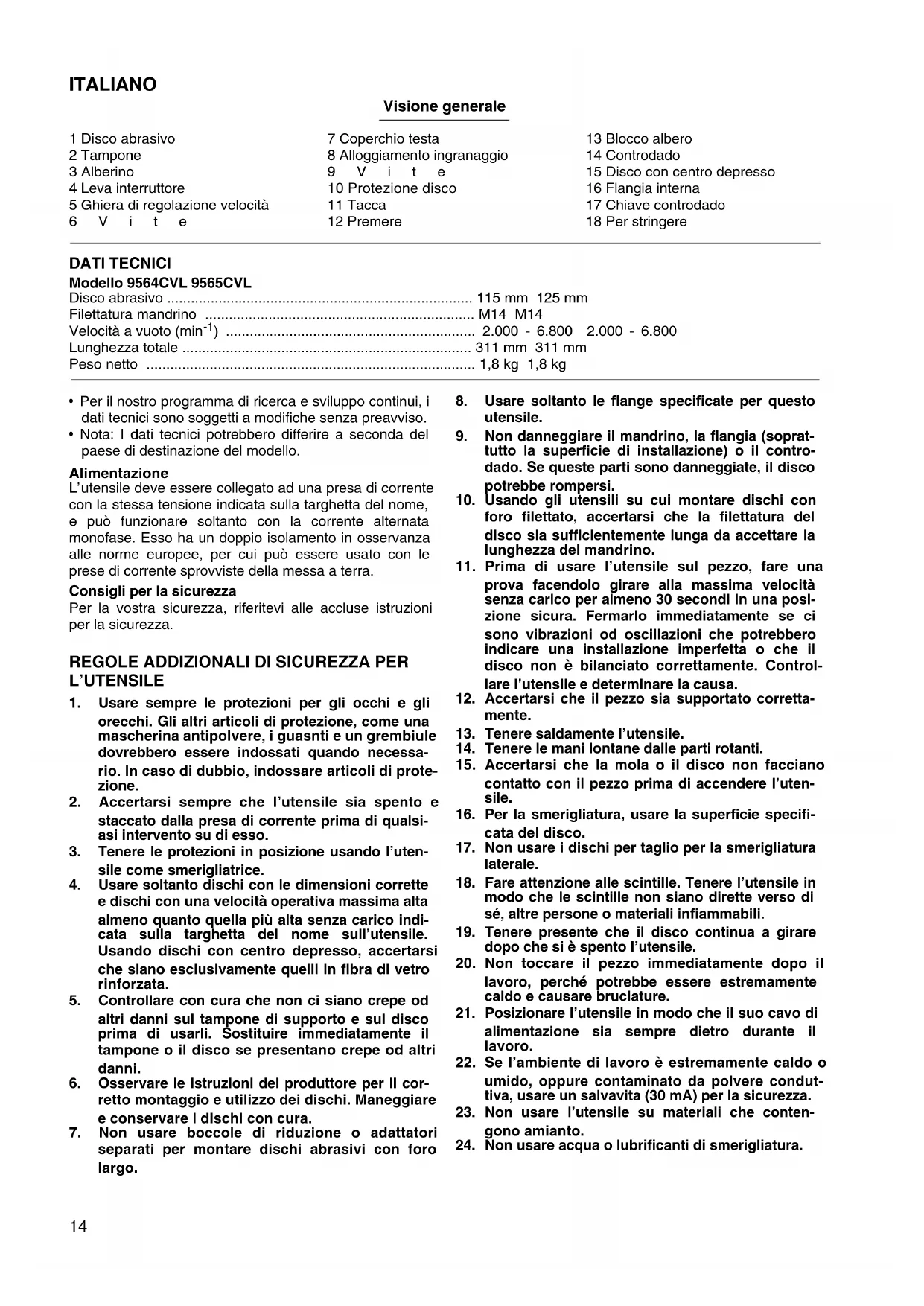 - L’uso continuo di un disco usurato può causarne l’esplosione e ferite gravi. MANUTENZIONE ATTENZIONE: Prima di eseguire qualsiasi lavoro sull’utensile, accerta- tevi sempre che sia spenta e staccata dalla presa di cor- rente. Riparazione e manutenzione L’utensile e le sue aperture di ventilazione devono essere sempre mantenuti puliti. Se sostanze estranee doves- sero penetrare tali parti, devono essere rimosse. Pulire regolarmente secondo quanta polvere è entrata nell’utensile. Se la protezione del disco è installata sull’utensile, rimuo- verla riferendosi a “Rimozione della protezione del disco”. Per mantenere la sicurezza e l’affidabilità del prodotto, le riparazioni, la manutenzione o le regolazioni dovrebbero essere eseguite da un centro di assistenza Makita auto- rizzato.17 NEDERLANDS Verklaring van algemene gegevens 1 Schuurschijf 2 Steunschijf 3As 4 Schakelaar 5 Snelheidsregelknop 6 Schroef 7 Hoofdkap 8 Tandwielhuis 9 Schroef 10 Beschermkap 11 Inkeping 12 Drukken 13 Asvergrendeling 14 Borgmoer 15 Schijf met verzonken asgat 16 Binnenflens 17 Borgmoersleutel 18 Vastdraaien TECHNISCHE GEGEVENS Model 9564CVL 9565CVL Schuurschijf ................................................................................. 115 mm 125 mm Asschroefdraad ........................................................................... M14 M14 Toerental onbelast/min. (min