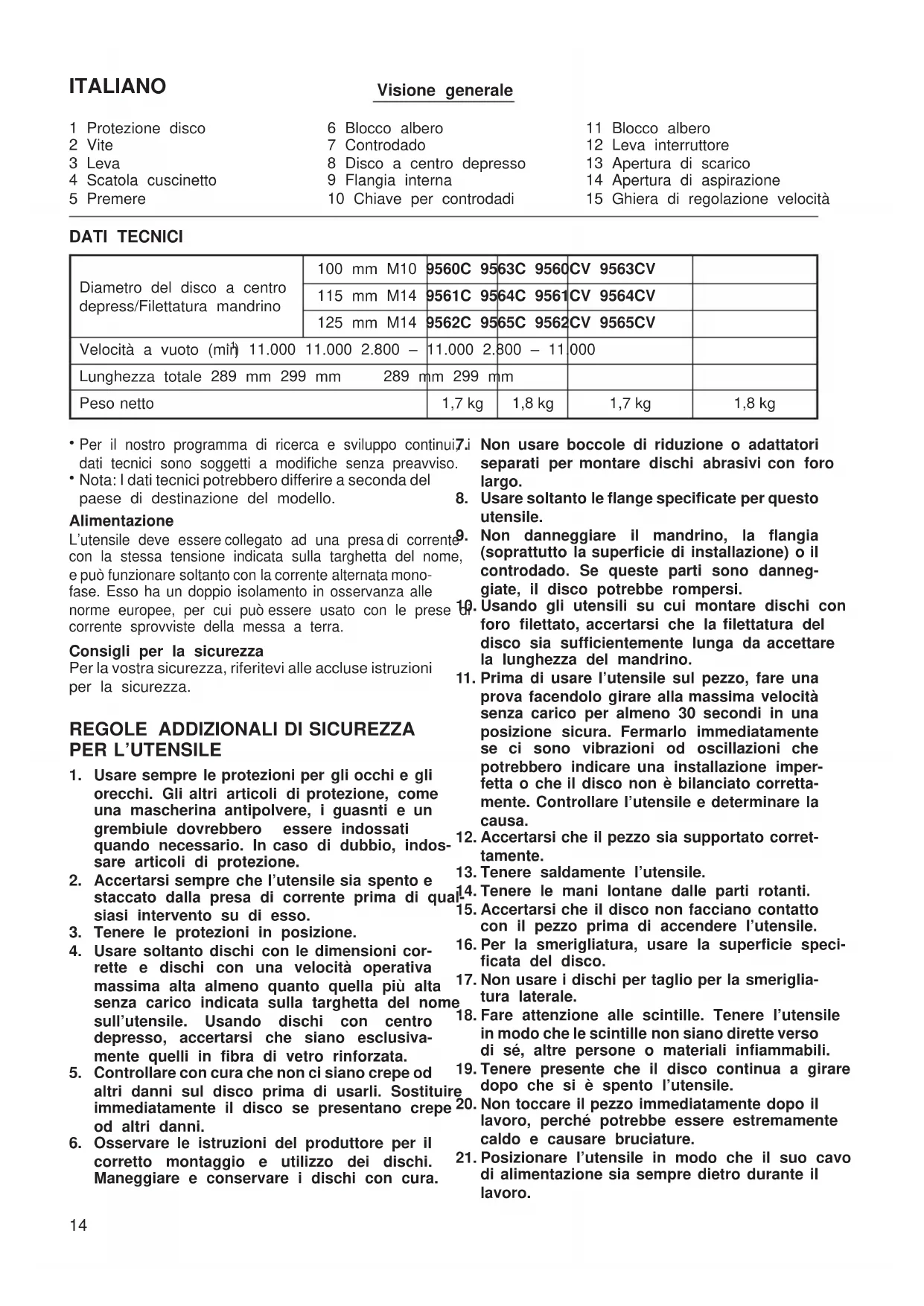 ITALIANO Rumore e vibrazione del modello 9563C/9563CV/9564C/9564CV/9565C/9565CV Il livello di pressione sonora pesata secondo la curva Aè di 83 dB (A). Il livello di rumore durante il lavoro potrebbe superare gli 85 dB (A). – Indossare i paraorecchi. – Il valore quadratico medio di accellerazione è di 5 m/s