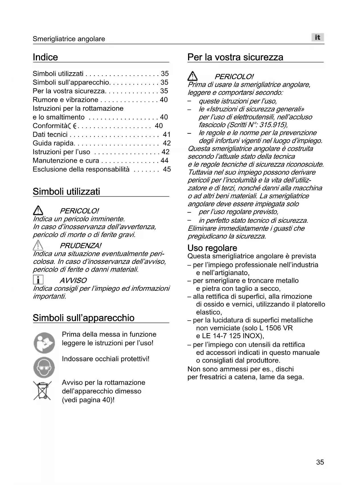 - Esclusione della responsabilità Simboli utilizzati PERICOLO! Indica un pericolo imminente. In caso d’inosservanza dell’avvertenza, pericolo di morte o di ferite gravi. PRUDENZA! Indica una situazione eventualmente peri- colosa. In caso d’inosservanza dell’avviso, pericolo di ferite o danni materiali. AVVISO Indica consigli per l’impiego ed informazioni importanti. Simboli sull’apparecchio Prima della messa in funzione leggere le istruzioni per l’uso! Indossare occhiali protettivi! Avviso per la rottamazione dell’apparecchio dimesso (vedi pagina 40)! Per la vostra sicurezza PERICOLO! Prima di usare la smerigliatrice angolare, leggere e comportarsi secondo: p. 45