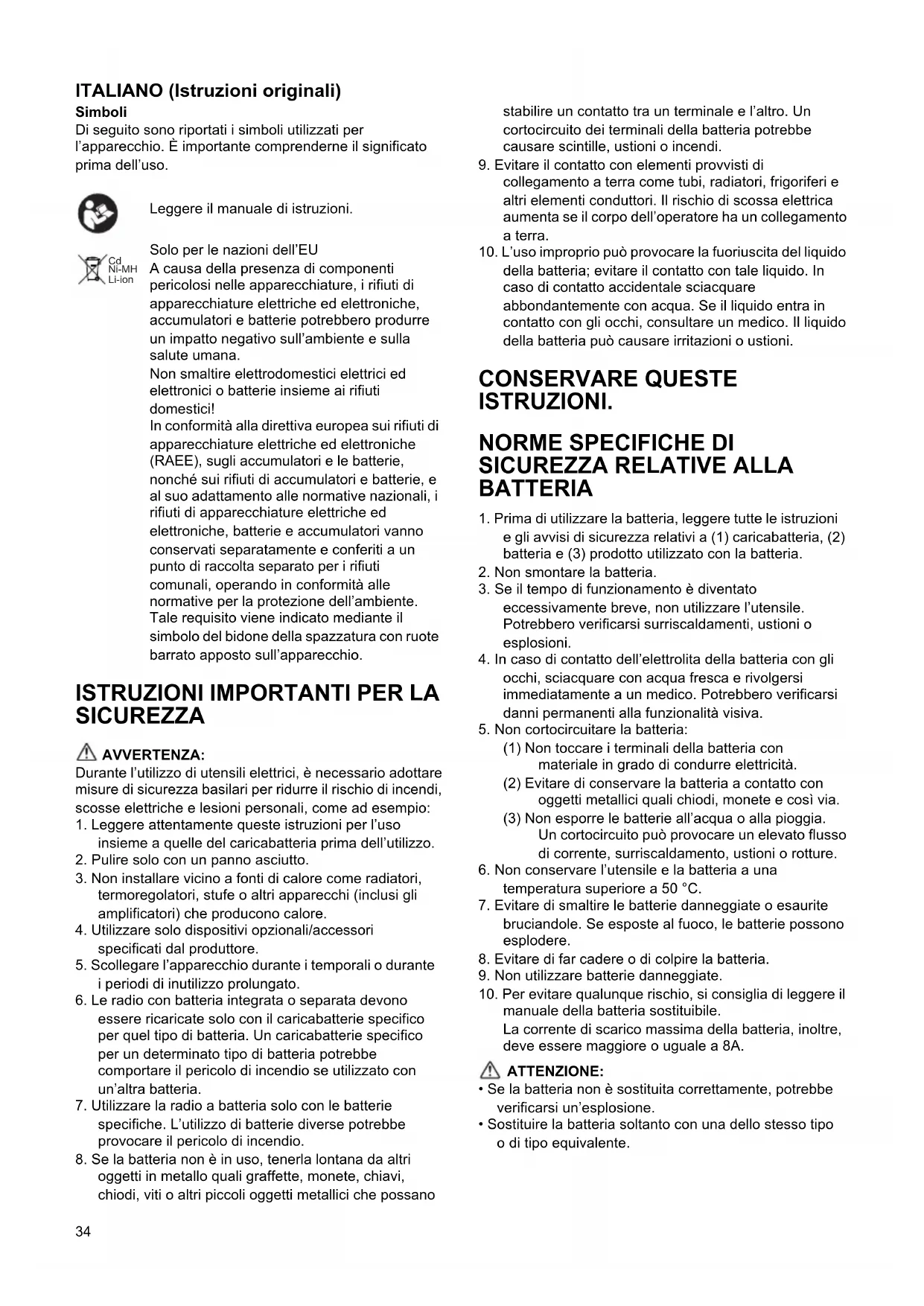 - Sostituire la batteria soltanto con una dello stesso tipo o di tipo equivalente. Leggere il manuale di istruzioni. Solo per le nazioni dell’EU A causa della presenza di componenti pericolosi nelle apparecchiature, i rifiuti di apparecchiature elettriche ed elettroniche, accumulatori e batterie potrebbero produrre un impatto negativo sull’ambiente e sulla salute umana. Non smaltire elettrodomestici elettrici ed elettronici o batterie insieme ai rifiuti domestici! In conformità alla direttiva europea sui rifiuti di apparecchiature elettriche ed elettroniche (RAEE), sugli accumulatori e le batterie, nonché sui rifiuti di accumulatori e batterie, e al suo adattamento alle normative nazionali, i rifiuti di apparecchiature elettriche ed elettroniche, batterie e accumulatori vanno conservati separatamente e conferiti a un punto di raccolta separato per i rifiuti comunali, operando in conformità alle normative per la protezione dell’ambiente. Tale requisito viene indicato mediante il simbolo del bidone della spazzatura con ruote barrato apposto sull’apparecchio.