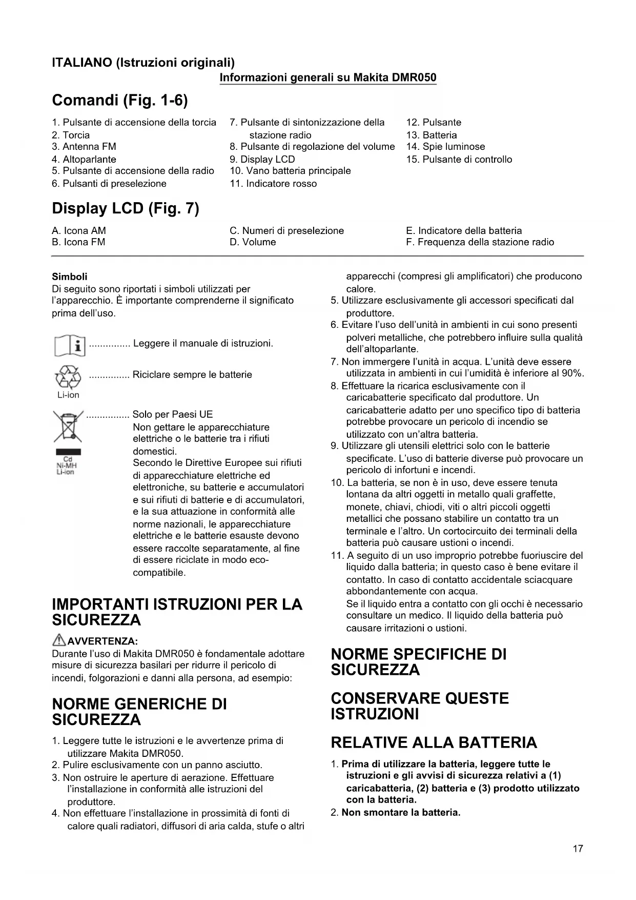 Stunden Ca. 12 Stunden Abmessungen (mit Akku BL1430) 263 mm x 75 mm x 196 mm Nettogewicht 0,95 kg (mit Akku BL1415/ BL1415N) 1,14 kg (mit Akku BL1430/ BL1430B/ BL1440/ BL1450/BL1460B) 0,99 kg (mit Akku BL1815/ BL1815N/ BL1820/ BL1820B) 1,23 kg (mit Akku BL1830/BL1830B/BL1840/BL1840B/ BL1850/BL1850B) 1,29 kg (mit Akku BL1860B)17 ITALIANO (Istruzioni originali) Informazioni generali su Makita DMR050 Comandi (Fig. 1-6) Display LCD (Fig. 7) Simboli Di seguito sono riportati i simboli utilizzati per l’apparecchio. È importante comprenderne il significato prima dell’uso. ............... Leggere il manuale di istruzioni. ............... Riciclare sempre le batterie ................ Solo per Paesi UE Non gettare le apparecchiature elettriche o le batterie tra i rifiuti domestici. Secondo le Direttive Europee sui rifiuti di apparecchiature elettriche ed elettroniche, su batterie e accumulatori e sui rifiuti di batterie e di accumulatori, e la sua attuazione in conformità alle norme nazionali, le apparecchiature elettriche e le batterie esauste devono essere raccolte separatamente, al fine di essere riciclate in modo eco- compatibile.