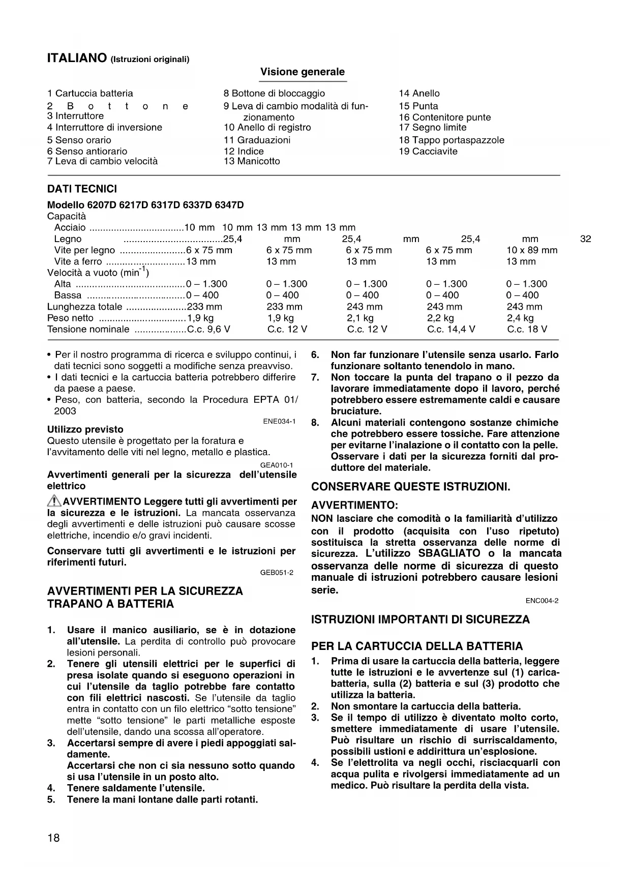ENE034-1 Utilizzo previsto Questo utensile è progettato per la foratura e l’avvitamento delle viti nel legno, metallo e plastica. GEA010-1 Avvertimenti generali per la sicurezza dell’utensile elettrico AVVERTIMENTO Leggere tutti gli avvertimenti per la sicurezza e le istruzioni. La mancata osservanza degli avvertimenti e delle istruzioni può causare scosse elettriche, incendio e/o gravi incidenti. Conservare tutti gli avvertimenti e le istruzioni per riferimenti futuri. GEB051-2