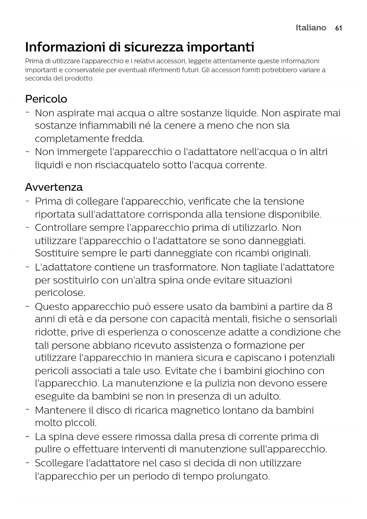 Italiano Informazioni di sicurezza importanti Prima di utilizzare l'apparecchio e i relativi accessori, leggete attentamente queste informazioniimportanti e conservatele per eventuali riferimenti futuri. Gli accessori forniti potrebbero variare aseconda del prodotto. Pericolo