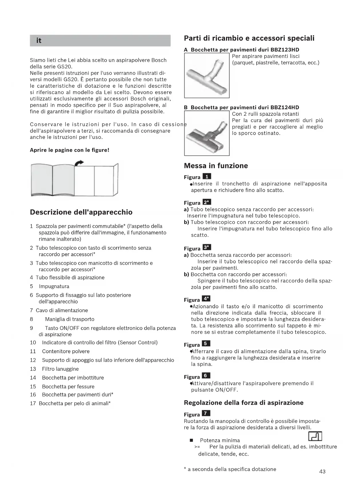 - selon le modèle43 Siamo lieti che Lei abbia scelto un aspirapolvere Bosch della serie GS20. Nelle presenti istruzioni per l'uso verranno illustrati di- versi modelli GS20. È pertanto possibile che non tutte le caratteristiche di dotazione e le funzioni descritte si riferiscano al modello da Lei scelto. Devono essere utilizzati esclusivamente gli accessori Bosch originali, pensati in modo specifico per il Suo aspirapolvere, al fine di garantire il miglior risultato di pulizia possibile. Conservare le istruzioni per l'uso. In caso di cessione dell'aspirapolvere a terzi, si raccomanda di consegnare anche le istruzioni per l'uso. Aprire le pagine con le figure! Descrizione dell'apparecchio 1 Spazzola per pavimenti commutabile* (l'aspetto della spazzola può differire dall'immagine, il funzionamento rimane inalterato) 2 Tubo telescopico con tasto di scorrimento senza raccordo per accessori* 3 Tubo telescopico con manicotto di scorrimento e raccordo per accessori* 4 Tubo flessibile di aspirazione 5 Impugnatura 6 Supporto di fissaggio sul lato posteriore dell'apparecchio 7 Cavo di alimentazione 8 Maniglia di trasporto 9 Tasto ON/OFF con regolatore elettronico della potenza di aspirazione 10 Indicatore di controllo del filtro (Sensor Control) 11 Contenitore polvere 12 Supporto di appoggio sul lato inferiore dell'apparecchio 13 Filtro lanuggine 14 Bocchetta per imbottiture 15 Bocchetta per fessure 16 Bocchetta per pavimenti duri* 17 Bocchetta per pelo di animali*