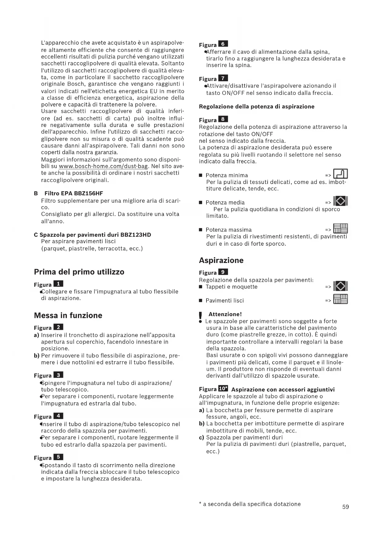 - a seconda della specifica dotazione59 L'apparecchio che avete acquistato è un aspirapolve- re altamente efficiente che consente di raggiungere eccellenti risultati di pulizia purché vengano utilizzati sacchetti raccoglipolvere di qualità elevata. Soltanto l'utilizzo di sacchetti raccoglipolvere di qualità eleva- ta, come in particolare il sacchetto raccoglipolvere originale Bosch, garantisce che vengano raggiunti i valori indicati nell'etichetta ene rgetica EU in merito a classe di efficienza energetica, aspirazione della polvere e capacità di trattenere la polvere. Usare sacchetti raccoglipolvere di qualità inferi- ore (ad es. sacchetti di carta) può inoltre influi- re negativamente sulla durata e sulle prestazioni dell'apparecchio. Infine l'utilizzo di sacchetti racco- glipolvere non su misura o di qualità scadente può causare danni all'aspirapolve re. Tali danni non sono coperti dalla nostra garanzia. Maggiori informazioni sull'argomento sono disponi- bili su www.bosch-home.com/dust-bag. Nel sito ave- te anche la possibilità di ordinare i nostri sacchetti raccoglipolvere originali. B Filtro EPA BBZ156HF Filtro supplementare per una migliore aria di scari- co. Consigliato per gli allergici. Da sostituire una volta all'anno. C Spazzola per pavimenti duri BBZ123HD Per aspirare pavimenti lisci (parquet, piastrelle, terracotta, ecc.) Prima del primo utilizzo Figura