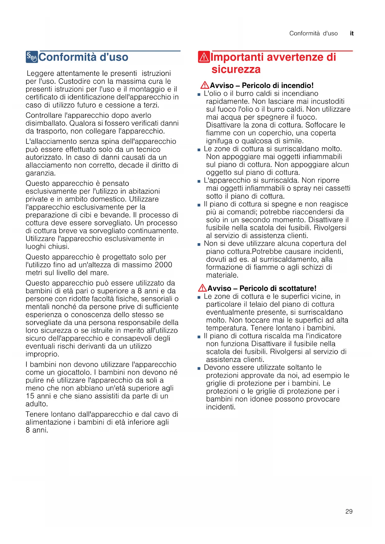 8Conformità d'uso Conf or mità d' us o Leggere attentamente le presenti istruzioni per l'uso. Custodire con la massima cura le presenti istruzioni per l'uso e il montaggio e il certificato di identificazione dell'apparecchio in caso di utilizzo futuro e cessione a terzi. Controllare l'apparecchio dopo averlo disimballato. Qualora si fossero verificati danni da trasporto, non collegare l'apparecchio. L'allacciamento senza spina dell'apparecchio può essere effettuato solo da un tecnico autorizzato. In caso di danni causati da un allacciamento non corretto, decade il diritto di garanzia. Questo apparecchio è pensato esclusivamente per l'utilizzo in abitazioni private e in ambito domestico. Utilizzare l'apparecchio esclusivamente per la preparazione di cibi e bevande. Il processo di cottura deve essere sorvegliato. Un processo di cottura breve va sorvegliato continuamente. Utilizzare l'apparecchio esclusivamente in luoghi chiusi. Questo apparecchio è progettato solo per l'utilizzo fino ad un'altezza di massimo 2000 metri sul livello del mare. Questo apparecchio può essere utilizzato da bambini di età pari o superiore a 8 anni e da persone con ridotte facoltà fisiche, sensoriali o mentali nonché da persone prive di sufficiente esperienza o conoscenza dello stesso se sorvegliate da una persona responsabile della loro sicurezza o se istruite in merito all'utilizzo sicuro dell'apparecchio e consapevoli degli eventuali rischi derivanti da un utilizzo improprio. I bambini non devono utilizzare l'apparecchio come un giocattolo. I bambini non devono né pulire né utilizzare l'apparecchio da soli a meno che non abbiano un'età superiore agli 15 anni e che siano assistiti da parte di un adulto. Tenere lontano dall'apparecchio e dal cavo di alimentazione i bambini di età inferiore agli 8 anni. (Importanti avvertenze di sicurezza Impor t ant i avv er t enze di si cur ezza :Avviso – Pericolo di incendio! ■ L'olio o il burro caldi si incendiano rapidamente. Non lasciare mai incustoditi sul fuoco l'olio o il burro caldi. Non utilizzare mai acqua per spegnere il fuoco. Disattivare la zona di cottura. Soffocare le fiamme con un coperchio, una coperta ignifuga o qualcosa di simile. Pericolo di incendio! ■ Le zone di cottura si surriscaldano molto. Non appoggiare mai oggetti infiammabili sul piano di cottura. Non appoggiare alcun oggetto sul piano di cottura. Pericolo di incendio! ■ L'apparecchio si surriscalda. Non riporre mai oggetti infiammabili o spray nei cassetti sotto il piano di cottura. Pericolo di incendio! ■ Il piano di cottura si spegne e non reagisce più ai comandi; potrebbe riaccendersi da solo in un secondo momento. Disattivare il fusibile nella scatola dei fusibili. Rivolgersi al servizio di assistenza clienti. Pericolo di ustioni! ■ Non si deve utilizzare alcuna copertura del piano cottura.Potrebbe causare incidenti, dovuti ad es. al surriscaldamento, alla formazione di fiamme o agli schizzi di materiale. :Avviso – Pericolo di scottature! ■ Le zone di cottura e le superfici vicine, in particolare il telaio del piano di cottura eventualmente presente, si surriscaldano molto. Non toccare mai le superfici ad alta temperatura. Tenere lontano i bambini. Pericolo di scottature! ■ Il piano di cottura riscalda ma l'indicatore non funziona Disattivare il fusibile nella scatola dei fusibili. Rivolgersi al servizio di assistenza clienti. Pericolo di ustioni! ■ Devono essere utilizzate soltanto le protezioni approvate da noi, ad esempio le griglie di protezione per i bambini. Le protezioni o le griglie di protezione per i bambini non idonee possono provocare incidenti.it Cause dei danni