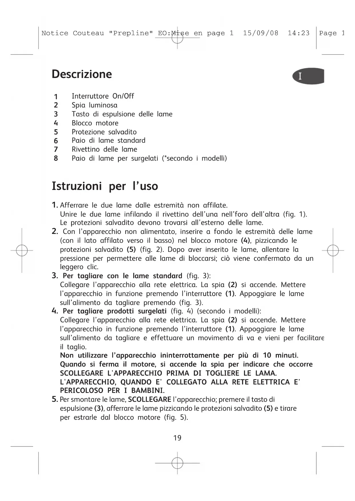 - Spegnere l'interruttore dell'apparecchio e scollegarlo dall'alimentazione prima di cambiare gli accessori, o prima di avvicinarsi alle parti in movimento. Notice Couteau "Prepline" EO:Mise en page 1 15/09/08 14:23 Page 2021 Contribuiamo alla salvaguardia dell’ambiente! Questo apparecchio contiene numerosi materiali valorizzabili o riciclabili. Smaltirlo presso il centro di raccolta rifiuti comunale o in un’apposita discarica, conformemente alle norme in vigore. In questi casi o per qualsiasi altra riparazione, È NECESSARIO rivolgersi a un riparatore autorizzato. Questo prodotto è stato progettato per un uso domestico; si declina pertanto ogni responsabilità e garanzia in caso di utilizzo a scopo professionale. Elettrodomestico o apparecchio elettronico a fine vita Notice Couteau "Prepline" EO:Mise en page 1 15/09/08 14:23 Page 2122