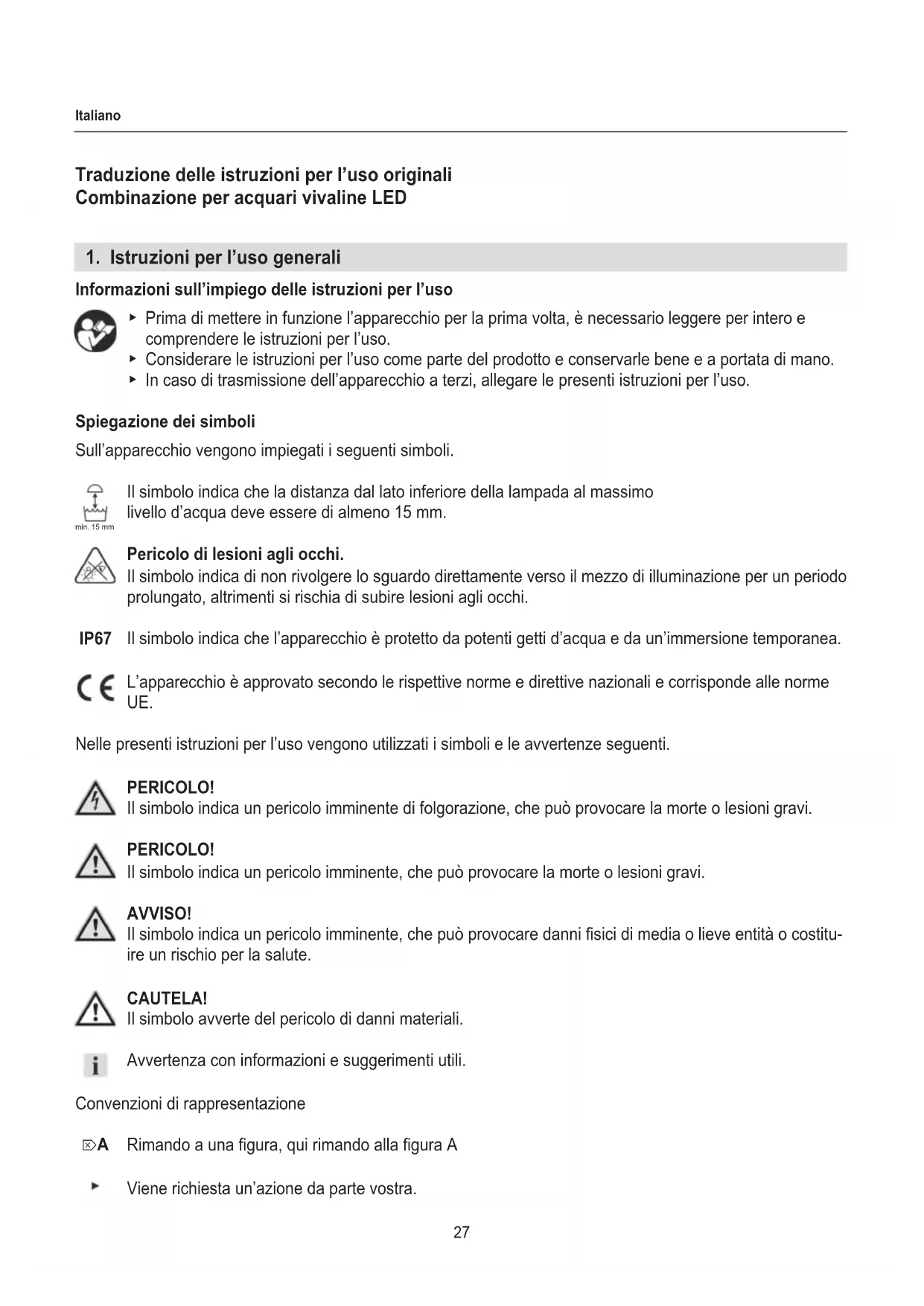 Informazioni sull’impiego delle istruzioni per l’uso ▶ Prima di mettere in funzione l’apparecchio per la prima volta, è necessario leggere per intero e comprendere le istruzioni per l’uso. ▶ Considerare le istruzioni per l’uso come parte del prodotto e conservarle bene e a portata di mano. ▶ In caso di trasmissione dell’apparecchio a terzi, allegare le presenti istruzioni per l’uso. Spiegazione dei simboli Sull’apparecchio vengono impiegati i seguenti simboli. Il simbolo indica che la distanza dal lato inferiore della lampada al massimo livello d’acqua deve essere di almeno 15 mm. Pericolo di lesioni agli occhi. Il simbolo indica di non rivolgere lo sguardo direttamente verso il mezzo di illuminazione per un periodo prolungato, altrimenti si rischia di subire lesioni agli occhi. Il simbolo indica che l’apparecchio è protetto da potenti getti d’acqua e da un’immersione temporanea. L’apparecchio è approvato secondo le rispettive norme e direttive nazionali e corrisponde alle norme UE. Nelle presenti istruzioni per l’uso vengono utilizzati i simboli e le avvertenze seguenti. PERICOLO! Il simbolo indica un pericolo imminente di folgorazione, che può provocare la morte o lesioni gravi. PERICOLO! Il simbolo indica un pericolo imminente, che può provocare la morte o lesioni gravi. AVVISO! Il simbolo indica un pericolo imminente, che può provocare danni sici di media o lieve entità o costitu- ire un rischio per la salute. CAUTELA! Il simbolo avverte del pericolo di danni materiali. Avvertenza con informazioni e suggerimenti utili. Convenzioni di rappresentazione Rimando a una gura, qui rimando alla gura A Viene richiesta un’azione da parte vostra. min. 15 mm IP67 ⌦A28 Italiano