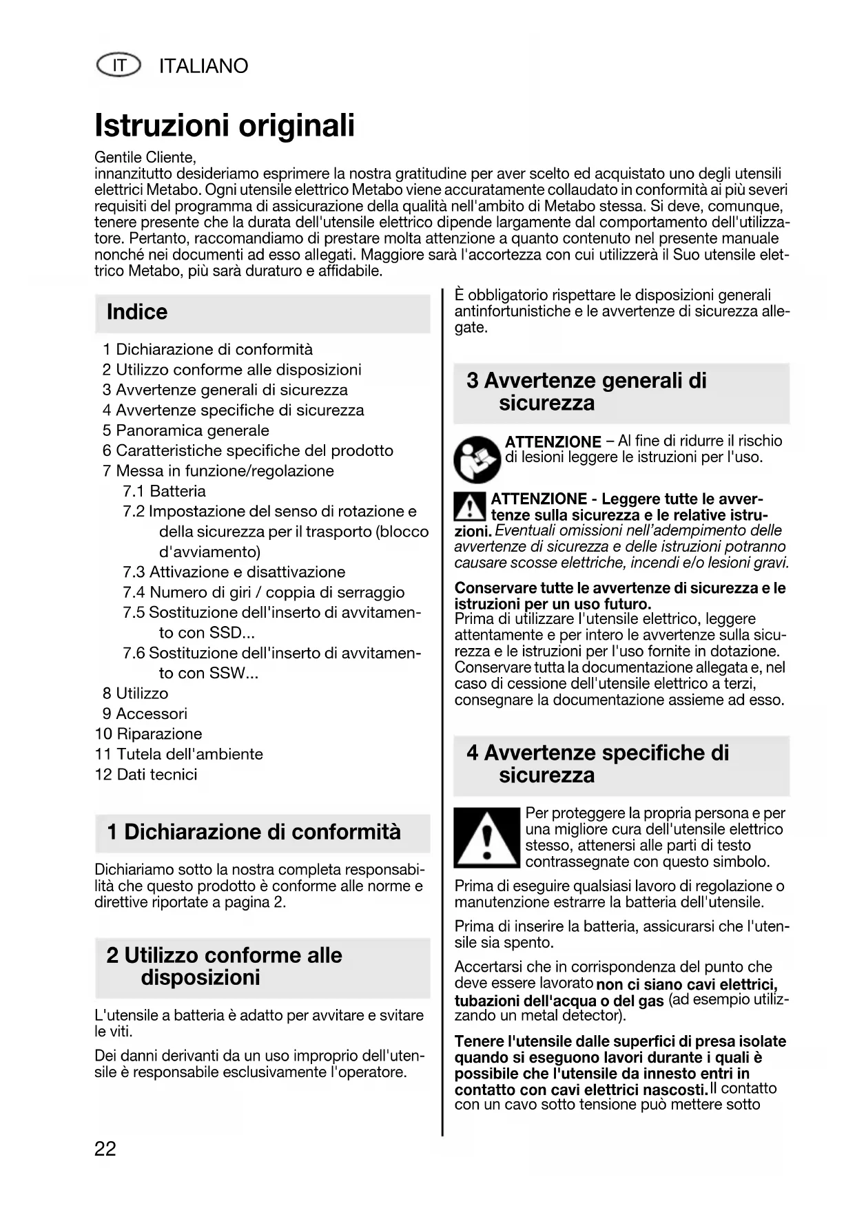 to con SSW... 8 Utilizzo 9 Accessori 10 Riparazione 11 Tutela dell'ambiente 12 Dati tecnici Dichiariamo sotto la nostra completa responsabi- lità che questo prodotto è conforme alle norme e direttive riportate a pagina 2. L'utensile a batteria è adatto per avvitare e svitare le viti. Dei danni derivanti da un uso improprio dell'uten- sile è responsabile esclusivamente l'operatore. È obbligatorio rispettare le disposizioni generali antinfortunistiche e le avvertenze di sicurezza alle- gate. ATTENZIONE – Al fine di ridurre il rischio di lesioni leggere le istruzioni per l'uso. ATTENZIONE - Leggere tutte le avver- tenze sulla sicurezza e le relative istru- zioni. Eventuali omissioni nell’adempimento delle avvertenze di sicurezza e delle istruzioni potranno causare scosse elettriche, incendi e/o lesioni gravi. Conservare tutte le avvertenze di sicurezza e le istruzioni per un uso futuro. Prima di utilizzare l'utensile elettrico, leggere attentamente e per intero le avvertenze sulla sicu- rezza e le istruzioni per l'uso fornite in dotazione. Conservare tutta la documentazione allegata e, nel caso di cessione dell'utensile elettrico a terzi, consegnare la documentazione assieme ad esso. Per proteggere la propria persona e per una migliore cura dell'utensile elettrico stesso, attenersi alle parti di testo contrassegnate con questo simbolo. Prima di eseguire qualsiasi lavoro di regolazione o manutenzione estrarre la batteria dell'utensile. Prima di inserire la batteria, assicurarsi che l'uten- sile sia spento. Accertarsi che in corrispondenza del punto che deve essere lavorato non ci siano cavi elettrici, tubazioni dell'acqua o del gas (ad esempio utiliz- zando un metal detector). Tenere l'utensile dalle superfici di presa isolate quando si eseguono lavori durante i quali è possibile che l'utensile da innesto entri in contatto con cavi elettrici nascosti. Il contatto con un cavo sotto tensione può mettere sotto Istruzioni originali Gentile Cliente, innanzitutto desideriamo esprimere la nostra gratitudine per aver scelto ed acquistato uno degli utensili elettrici Metabo. Ogni utensile elettrico Metabo viene accuratamente collaudato in conformità ai più severi requisiti del programma di assicurazione della qualità nell'ambito di Metabo stessa. Si deve, comunque, tenere presente che la durata dell'utensile elettrico dipende largamente dal comportamento dell'utilizza- tore. Pertanto, raccomandiamo di prestare molta attenzione a quanto contenuto nel presente manuale nonché nei documenti ad esso allegati. Maggiore sarà l'accortezza con cui utilizzerà il Suo utensile elet- trico Metabo, più sarà duraturo e affidabile. Indice 1 Dichiarazione di conformità 2 Utilizzo conforme alle disposizioni 3 Avvertenze generali di sicurezza 4 Avvertenze specifiche di sicurezza 17026933_0311 SSW SSD 14_4 18.book Seite 22 Mittwoch, 9. März 2011 1:55 13ITALIANO