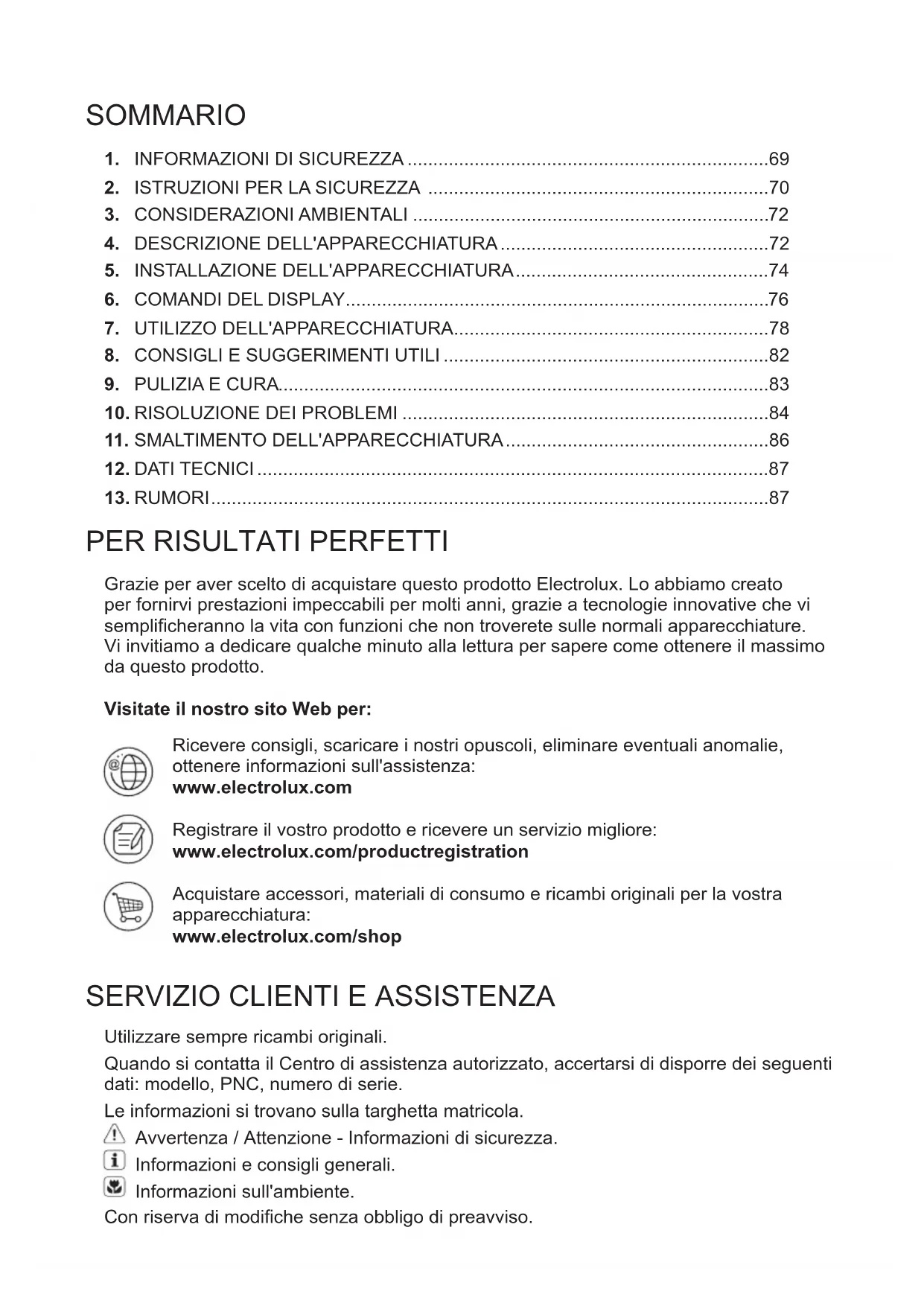Grazie per aver scelto di acquistare questo prodotto Electrolux. Lo abbiamo creato per fornirvi prestazioni impeccabili per molti anni, grazie a tecnologie innovative che vi semplicheranno la vita con funzioni che non troverete sulle normali apparecchiature. Vi invitiamo a dedicare qualche minuto alla lettura per sapere come ottenere il massimo da questo prodotto. Visitate il nostro sito Web per: Ricevere consigli, scaricare i nostri opuscoli, eliminare eventuali anomalie, ottenere informazioni sull'assistenza: www.electrolux.com Registrare il vostro prodotto e ricevere un servizio migliore: www.electrolux.com/productregistration Acquistare accessori, materiali di consumo e ricambi originali per la vostra apparecchiatura: www.electrolux.com/shop