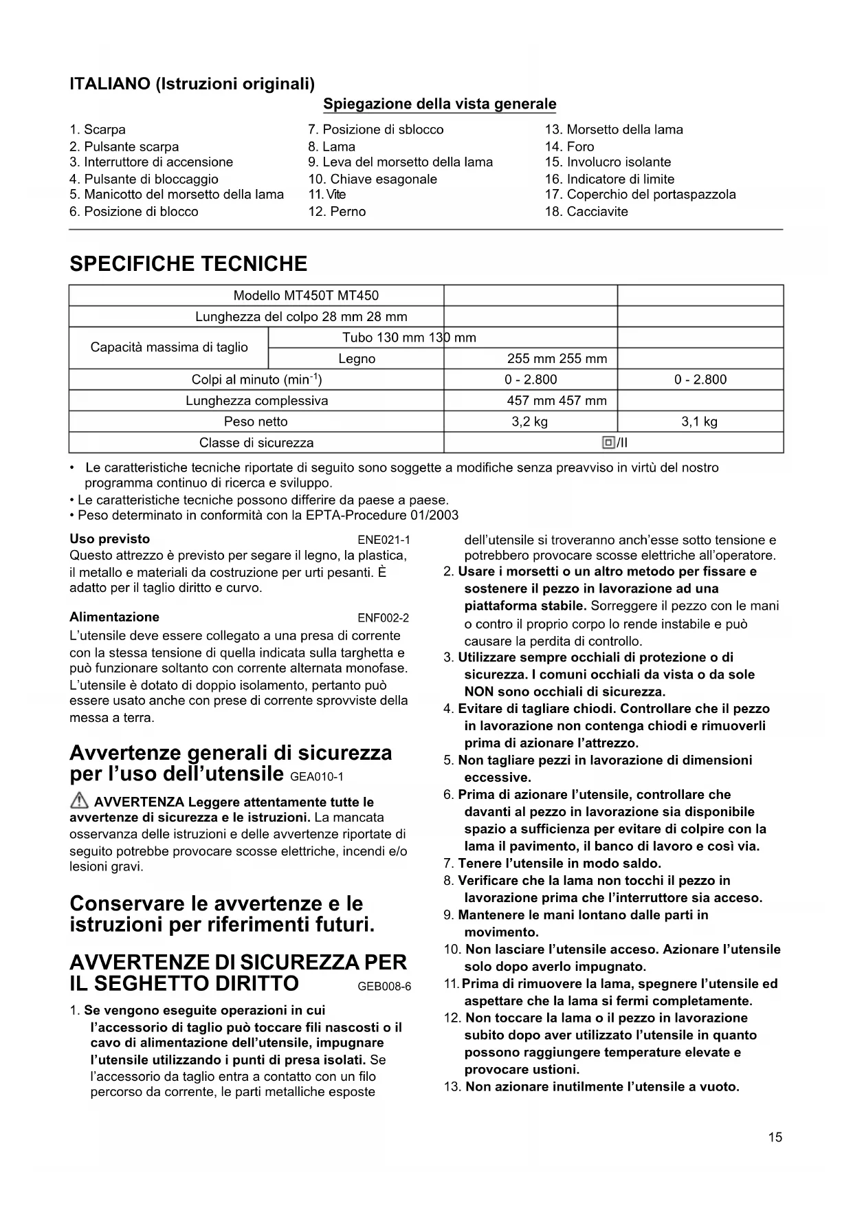 - Peso determinato in conformità con la EPTA-Procedure 01/2003 Uso previsto ENE021-1 Questo attrezzo è previsto per segare il legno, la plastica, il metallo e materiali da costruzione per urti pesanti. È adatto per il taglio diritto e curvo. Alimentazione ENF002-2 L’utensile deve essere collegato a una presa di corrente con la stessa tensione di quella indicata sulla targhetta e può funzionare soltanto con corrente alternata monofase. L’utensile è dotato di doppio isolamento, pertanto può essere usato anche con prese di corrente sprovviste della messa a terra. Avvertenze generali di sicurezza per l’uso dell’utensile GEA010-1 AVVERTENZA Leggere attentamente tutte le avvertenze di sicurezza e le istruzioni. La mancata osservanza delle istruzioni e delle avvertenze riportate di seguito potrebbe provocare scosse elettriche, incendi e/o lesioni gravi. Conservare le avvertenze e le istruzioni per riferimenti futuri.
