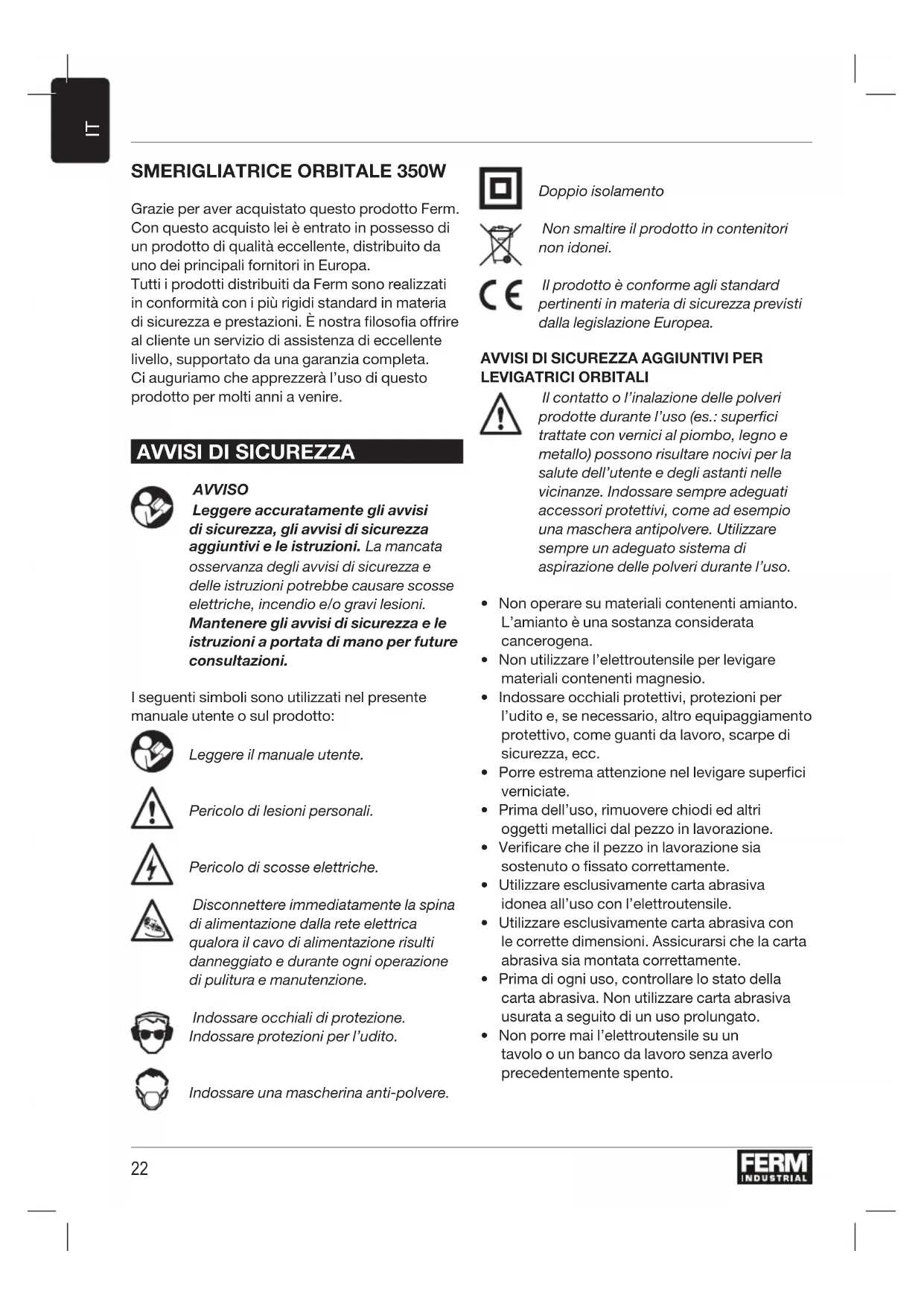 LEVIGATRICI ORBITALI Il contatto o l’inalazione delle polveri prodotte durante l’uso (es.: superfici trattate con vernici al piombo, legno e metallo) possono risultare nocivi per la salute dell’utente e degli astanti nelle vicinanze. Indossare sempre adeguati accessori protettivi, come ad esempio una maschera antipolvere. Utilizzare sempre un adeguato sistema di aspirazione delle polveri durante l’uso.