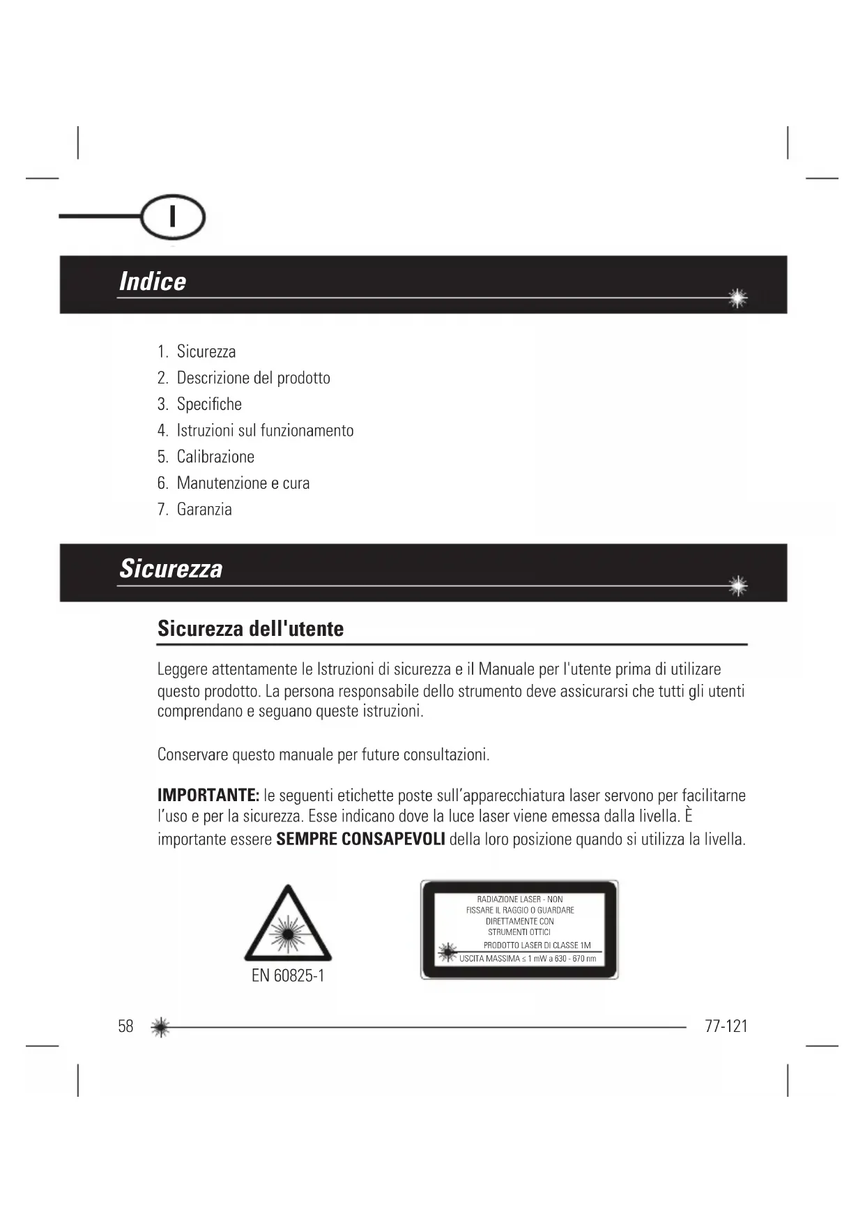 LT LT LT LT TR TR TR HR HR HR HR59 77-121 NON rimuovere nessuna etichetta sulla parte esterna. Questo strumento deve essere utilizzando unicamente per lavori di livellamento e tracciatura come descritto in questo manuale. ASSICURARSI SEMPRE che qualsiasi persona nelle vicinanze dell’area di utilizzo sia a conoscenza dei rischi derivanti dal guardare direttamente l’apparecchiatura laser. NON utilizzare in combinazione con altri strumento ottici. Non modificare o manipolare lo strumento, né utilizzare in applicazioni diverse da quelle descritte nel manuale. NON guardare nel raggio con strumenti ottici, quali lenti d'ingrandimento, binocoli o telescopi. NON fissare il raggio laser e non rivolgerlo verso altre persone. Assicurarsi che lo strumento non sia posizionato al livello degli occhi. Solitamente gli occhi si proteggono con una reazione naturale, come il riflesso di battere le palpebre. NON rivolgere il raggio laser verso altre persone. SPEGNERE SEMPRE l’apparecchiatura laser quando non viene utilizzata. Se si lascia l’apparecchiatura laser accesa, si aumenta il rischio di guardare inavvertitamente all’interno del raggio laser. NON utilizzare l’apparecchiatura laser in aree in cui è presente del combustibile, come ad esempio in presenza di liquidi infiammabili, gas o polveri. NON smontare l’apparecchiatura laser. All’interno non sono presenti componenti la cui manutenzione può essere eseguita dall’utente. Lo smontaggio del laser farà decadere la garanzia del prodotto. Non modificare in nessun modo il prodotto. La modifica dell‘apparecchiatura laser potrebbe causare l’esposizione a radiazioni pericolose. NON utilizzare questo strumento in aree in cui vi è rischio di esplosioni. NOTA: poiché il raggio laser è di tipo focalizzato, assicurarsi di controllare il percorso del raggio su una distanza relativamente lunga e prendere tutte le precauzioni necessarie per assicurarsi che il raggio non possa interferire con altre persone.60 77-121 ATTENZIONE: le batterie possono esplodere o avere fuoriuscite e possono provocare lesioni o incendi. Per ridurre questo rischio: ATTENERSI SEMPRE a tutte le istruzioni e agli avvisi presenti sull'etichetta della batteria e sulla confezione. NON provocare il corto circuito dei terminali della batteria NON ricaricare le batterie alcaline. NON usare contemporaneamente batterie nuove e vecchie. Sostituirle tutte contemporaneamente con batterie nuove della stessa marca e dello stesso tipo. NON usare batterie con sostanze chimiche differenti. NON smaltire le batterie nel fuoco. TENERE SEMPRE le batterie fuori dalla portata dei bambini. RIMUOVERE SEMPRE le batterie se il dispositivo non sarà utilizzato per diversi mesi. NOTA: assicurarsi che vengano utilizzate le batterie giuste come raccomandato. NOTA: assicurarsi che le batterie siano inserite nel modo giusto, con la polarità corretta. NON smaltire questo prodotto con i rifiuti domestici. SMALTIRE SEMPRE le batterie nel rispetto delle norme locali. RICICLARE rispettando le norme locali per la raccolta e lo smaltimento di rifiuti elettrici ed elettronici in conformità con la Direttiva sui rifiuti di apparecchi elettrici ed elettronici (WEEE). Sicurezza delle batterie Fine vita utile61 77-121