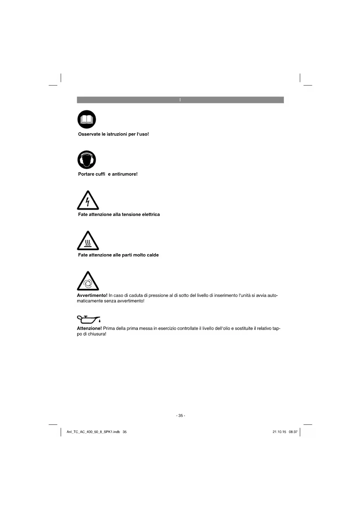 Fate attenzione alla tensione elettrica Fate attenzione alle parti molto calde Avvertimento! In caso di caduta di pressione al di sotto del livello di inserimento l‘unità si avvia auto- maticamente senza avvertimento! Attenzione! Prima della prima messa in esercizio controllate il livello dell‘olio e sostituite il relativo tap- po di chiusura! Osservate le istruzioni per l‘uso! Portare cuffi e antirumore! Anl_TC_AC_400_50_8_SPK1.indb 35Anl_TC_AC_400_50_8_SPK1.indb 35 21.10.15 08:3721.10.15 08:37I