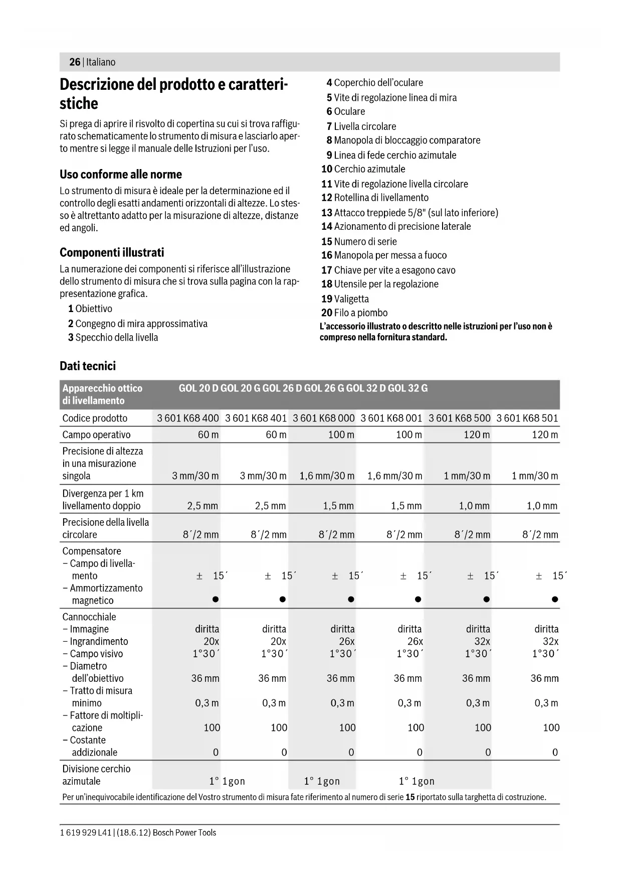 OBJ_BUCH-1239-002.book Page 25 Monday, June 18, 2012 10:51 AM26 | Italiano 1 619 929 L41 | (18.6.12) Bosch Power Tools Descrizione del prodotto e caratteri- stiche Si prega di aprire il risvolto di copertina su cui si trova raffigu- rato schematicamente lo strumento di misura e lasciarlo aper- to mentre si legge il manuale delle Istruzioni per l’uso. Uso conforme alle norme Lo strumento di misura è ideale per la determinazione ed il controllo degli esatti andamenti orizzontali di altezze. Lo stes- so è altrettanto adatto per la misurazione di altezze, distanze ed angoli. Componenti illustrati La numerazione dei componenti si riferisce all’illustrazione dello strumento di misura che si trova sulla pagina con la rap- presentazione grafica. 1 Obiettivo 2 Congegno di mira approssimativa 3 Specchio della livella 4 Coperchio dell’oculare 5 Vite di regolazione linea di mira 6 Oculare 7 Livella circolare 8 Manopola di bloccaggio comparatore 9 Linea di fede cerchio azimutale 10 Cerchio azimutale 11 Vite di regolazione livella circolare 12 Rotellina di livellamento 13 Attacco treppiede 5/8" (sul lato inferiore) 14 Azionamento di precisione laterale 15 Numero di serie 16 Manopola per messa a fuoco 17 Chiave per vite a esagono cavo 18 Utensile per la regolazione 19 Valigetta 20 Filo a piombo L’accessorio illustrato o descritto nelle istruzioni per l’uso non è compreso nella fornitura standard. Dati tecnici Apparecchio ottico di livellamento GOL 20 D GOL 20 G GOL 26 D GOL 26 G GOL 32 D GOL 32 G Codice prodotto 3 601 K68 400 3 601 K68 401 3 601 K68 000 3 601 K68 001 3 601 K68 500 3 601 K68 501 Campo operativo 60 m 60 m 100 m 100 m 120 m 120 m Precisione di altezza in una misurazione singola 3 mm/30 m 3 mm/30 m 1,6 mm/30 m 1,6 mm/30 m 1 mm/30 m 1 mm/30 m Divergenza per 1 km livellamento doppio 2,5 mm 2,5 mm 1,5 mm 1,5 mm 1,0 mm 1,0 mm Precisione della livella circolare 8´/2 mm 8´/2 mm 8´/2 mm 8´/2 mm 8´/2 mm 8´/2 mm Compensatore – Campo di livella- mento – Ammortizzamento magnetico ± 15´