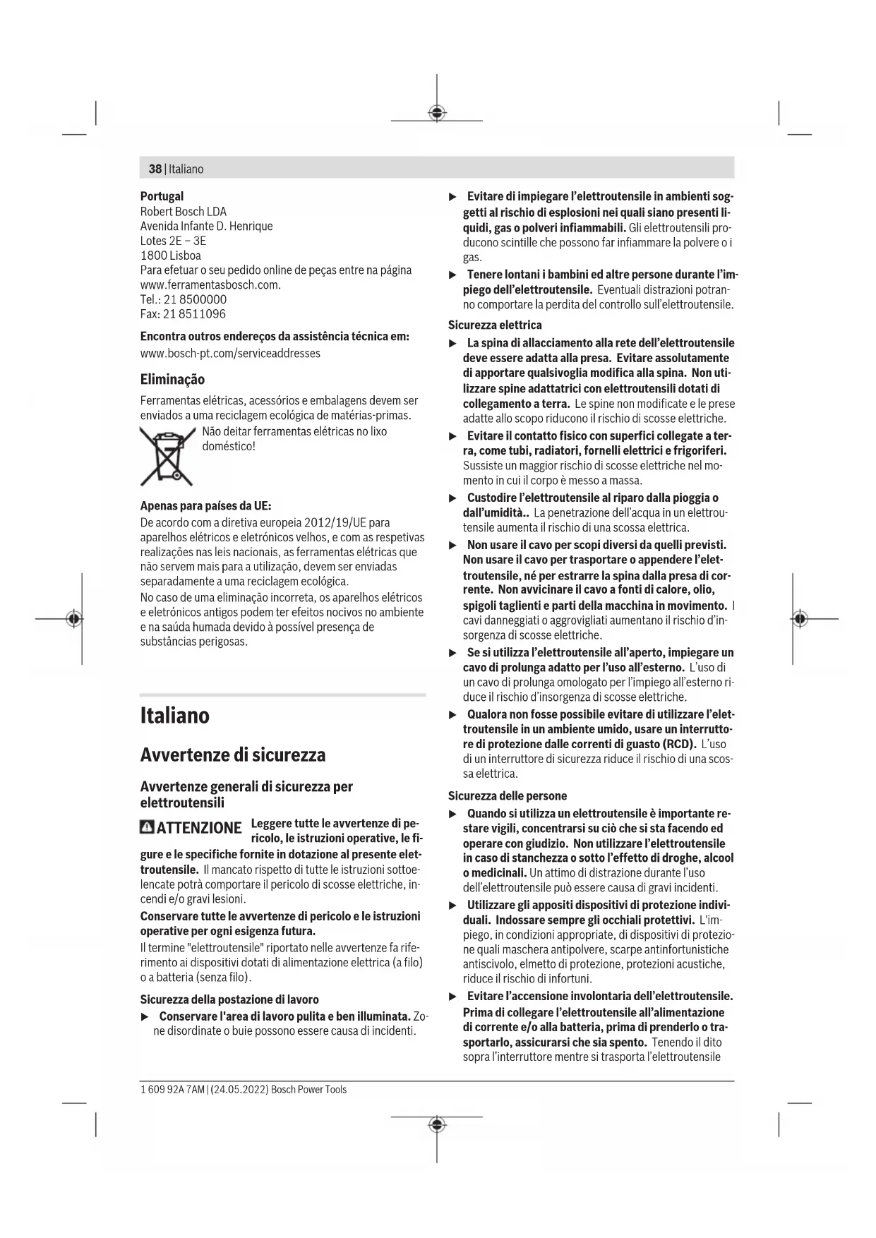 O lixamento de chapas finas ou de outros materiais facilmente vibrantes com grande superfície pode causar um valor de emissão de ruído aumentado até 15dB. Através de tapetes pesados de amortecimento é possível reduzir a elevada emissão sonora. A elevada emissão de ruído deve ser considerada tanto na avaliação dos riscos da potência do ruído como na seleção de uma proteção auditiva adequada. O nível de vibrações indicado nestas instruções e o valor de emissões sonoras foram medidos de acordo com um processo de medição normalizado e podem ser utilizados para a comparação de ferramentas elétricas. Também são Bosch Power Tools 1 609 92A 7AM | (24.05.2022)36 | Português adequados para uma avaliação provisória das emissões sonoras e de vibrações. O nível de vibrações indicado e o valor de emissões sonoras representam as aplicações principais da ferramenta elétrica. Se a ferramenta elétrica for utilizada para outras aplicações, com outras ferramentas de trabalho ou com manutenção insuficiente, é possível que o nível de vibrações e de emissões sonoras seja diferente. Isto pode aumentar sensivelmente a emissão sonora e de vibrações para o período completo de trabalho. Para uma estimação exata da emissão sonora e de vibrações, também deveriam ser considerados os períodos nos quais o aparelho está desligado ou funciona, mas não está sendo utilizado. Isto pode reduzir a emissão sonora e de vibrações durante o completo período de trabalho. Além disso também deverão ser estipuladas medidas de segurança para proteger o operador contra o efeito de vibrações, como por exemplo: manutenção de ferramentas elétricas e acessórios, manter as mãos quentes e organização dos processos de trabalho. Proteção contra rearranque involuntário A proteção contra rearranque involuntário evita que a ferramenta elétrica possa arrancar descontroladamente após uma interrupção da alimentação de corrente elétrica. Para recolocar em funcionamento coloque o interruptor de ligar/desligar (6) na posição desligada e ligue novamente a ferramenta elétrica. Nota: No caso de desligar e voltar a ligar demasiado rápido, a proteção contra rearranque involuntário pode ativar-se e a ferramenta elétrica não arranca mesmo acionando o interruptor de ligar/desligar (6). Coloque o interruptor de ligar/desligar (6) na posição desligada e ligue novamente a ferramenta elétrica. Montagem u Antes de todos trabalhos na ferramenta elétrica deverá puxar a ficha de rede da tomada. Montar o dispositivo de proteção u Antes de todos trabalhos na ferramenta elétrica deverá puxar a ficha de rede da tomada. u Ajuste a tampa de proteção(2) de modo a evitar que voem faíscas na direção do operador. Tampa de proteção para lixar (verfiguraA) Coloque a tampa de proteção(2) na gola do veio. Ajuste a posição da tampa de proteção(2) de acordo com os requisitos da operação. Bloqueie a tampa de proteção(2) com o parafuso de fixação(9) e aperte o parafuso de fixação com pelo menos 10Nm. Montar as ferramentas de lixar (verfiguraB) Os abrasivos devem girar perfeitamente. Abrasivos deformados não devem continuar a ser utilizados, mas devem ser trocados ou alinhados com uma pedra de afiar (acessório). Com a pedra de afiar também é possível desenvolver formas especiais de livre escolha a partir das formas básicas do abrasivo. Se utilizar ferramentas de lixar com inserto roscado, certifique-se de que a extremidade do veio de trabalho(3) não toca no fundo perfurado da ferramenta de lixar. – Rode o veio de trabalho(3), até que o furo no veio de trabalho(3) esteja alinhado com os entalhes na carcaça. Insira o pino de retenção(10) através dos entalhes na carcaça e do furo do veio de trabalho(3). – Solte a porca de aperto(1) com a chave de dois furos(11) fornecida e retire-a. – Limpe o veio de trabalho(3) e todas as peças a serem montadas. – Coloque o abrasivo e aperte a porca de aperto(1) com a chave de dois furos(11). Certifique-se de que o abrasivo se pode mover livremente na tampa de proteção(2). u Utilize abrasivos cónicos apenas em conjunto com tampa de proteção aberta(2) e o sistema de aperto adequado (porca de aperto(1) ou porca de aperto rápido(7) e flange de admissão (4)). Trocar o flange de admissão (verfiguraC) Para fixar abrasivos cónicos, utilize o flange de admissão(4), a porca de aperto(1) e a tampa de proteção aberta(2). Alavanque com uma chave de parafusos o anel de retenção(13) para fora da ranhura do veio de trabalho(3) e retire o flange de admissão(4). Monte o flange de admissão(4) adequado de forma correta. Porca de aperto rápido (verfiguraD) Para uma troca fácil de ferramenta de lixar sem utilizar outras ferramentas, em vez da porca de aperto(1) pode utilizar a porca de aperto rápido(7). u A porca de aperto rápido(7) não pode ser utilizada para escovas. Utilize apenas uma porca de aperto rápido(7)que esteja em perfeito estado e sem danos. Ao enroscar tenha atenção para que o lado marcado da porca de aperto rápido(7) não aponte para o disco de rebarbar; a seta tem de apontar para a marca de índice (12). Rode o veio de trabalho(3), até que o furo no veio de trabalho(3) e os entalhes na carcaça estejam alinhados. Insira o pino de retenção(10) através dos entalhes na carcaça e do furo do veio de trabalho(3). Para apertar a porca de aperto rápido(7) rode o disco de rebarbar para a direita com força Uma porca de aperto bem fixada e sem danos pode ser desapertada manualmente rodando o anel serrilhado para a esquerda. Nunca solte uma porca de aperto rápido presa com um alicate, utilize sempre a chave de dois furos(11). 1 609 92A 7AM | (24.05.2022) Bosch Power ToolsPortuguês | 37 Aspiração de pó/de aparas Pós de materiais como por exemplo, tintas que contém chumbo, alguns tipos de madeira, minerais e metais, podem ser nocivos à saúde. O contacto ou a inalação dos pó
