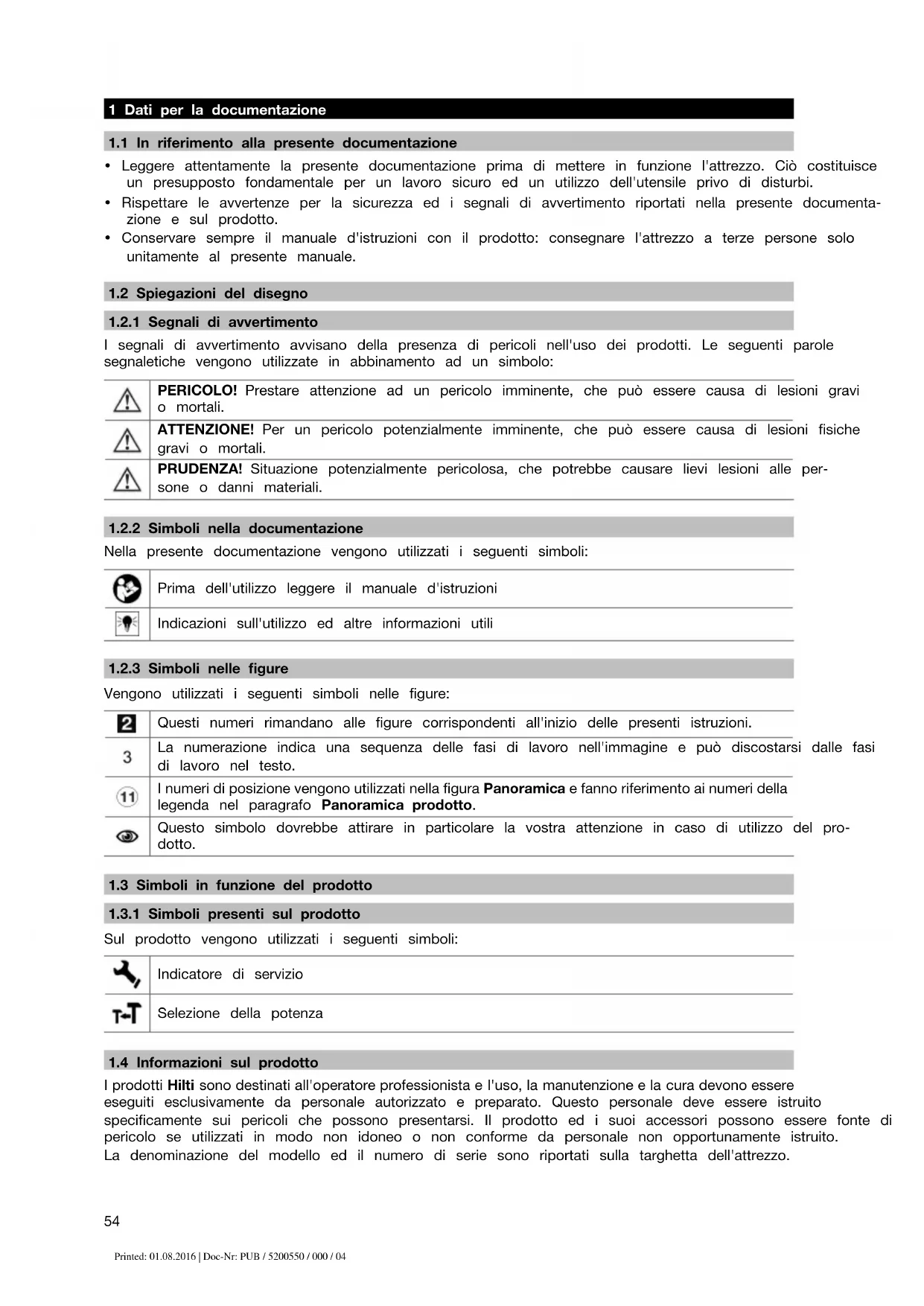 I prodotti Hilti sono destinati all'operatore professionista e l'uso, la manutenzione e la cura devono essere eseguiti esclusivamente da personale autorizzato e preparato. Questo personale deve essere istruito specificamente sui pericoli che possono presentarsi. Il prodotto ed i suoi accessori possono essere fonte di pericolo se utilizzati in modo non idoneo o non conforme da personale non opportunamente istruito. La denominazione del modello ed il numero di serie sono riportati sulla targhetta dell'attrezzo. Printed: 01.08.2016 | Doc-Nr: PUB / 5200550 / 000 / 0455 ▶ Riportare il numero di serie nella tabella seguente. I dati relativi al prodotto sono necessari in caso di richieste al nostro rappresentante o al Centro Riparazioni. Dati prodotto Martello scalpellatore TE 800AVR Generazione 01 N. di serie