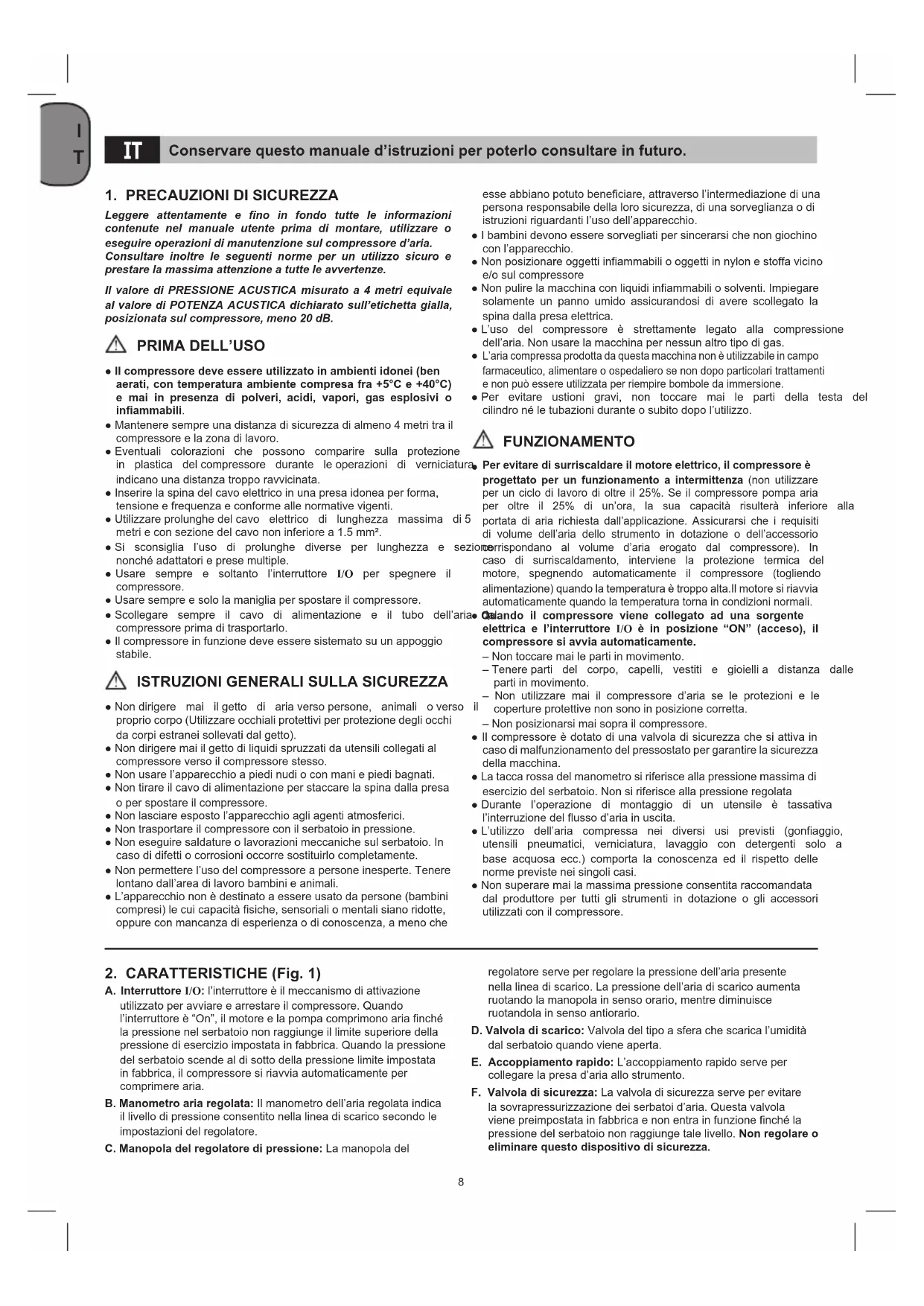 F. Valvola di sicurezza: La valvola di sicurezza serve per evitare la sovrappressurizzazione dei serbatoi d'aria. Questa valvolaiene preimpostata in fabbrica e non entra in funzione finché la pressione del serbatoio non raggiunge tale livello. Non regolare o eliminare quello dispositivo di sicurezza.
