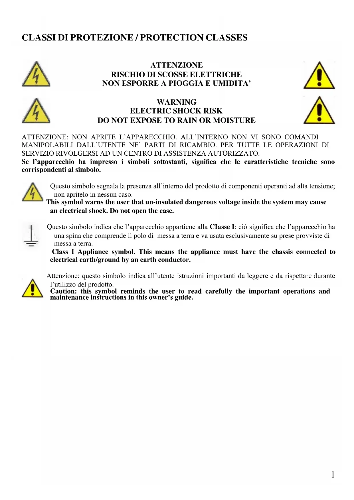 DO NOT EXPOSE TO RAIN OR MOISTURE ATTENZIONE: NON APRITE L’APPARECCHIO. ALL’INTERNO NON VI SONO COMANDI MANIPOLABILI DALL’UTENTE NE’ PARTI DI RICAMBIO. PER TUTTE LE OPERAZIONI DI SERVIZIO RIVOLGERSI AD UN CENTRO DI ASSISTENZA AUTORIZZATO. Se l’apparecchio ha impresso i simboli sottostanti, significa che le caratteristiche tecniche sono corrispondenti al simbolo. Questo simbolo segnala la presenza all’interno del prodotto di componenti operanti ad alta tensione; non apritelo in nessun caso. This symbol warns the user that un-insulated dangerous voltage inside the system may cause an electrical shock. Do not open the case. Questo simbolo indica che l’apparecchio appartiene alla CIasse I: ciò significa che l’apparecchio ha una spina che comprende il polo di messa a terra e va usata esclusivamente su prese provviste di messa a terra. Class I Appliance symbol. This means the appliance must have the chassis connected to electrical earth/ground by an earth conductor. Attenzione: questo simbolo indica all’utente istruzioni importanti da leggere e da rispettare durante l’utilizzo del prodotto. Caution: this symbol reminds the user to read carefully the important operations and maintenance instructions in this owner’s guide.2