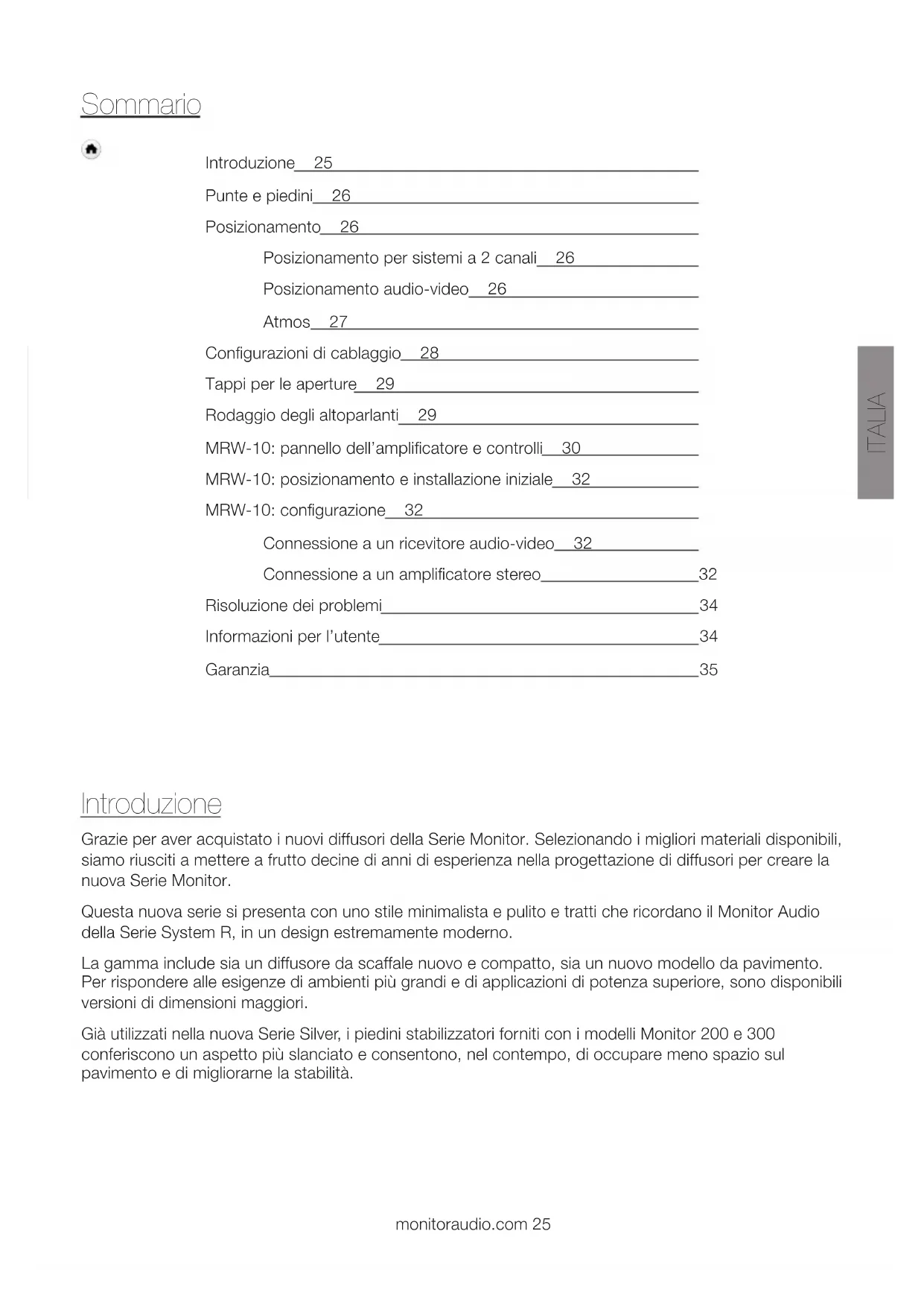 Adresse email ............................................................................................................................. Numéro de téléphone .................................................................................................................FRANCAIS monitoraudio.com 23 Garantie Le savoir-faire et la performance de ce produit sont garantis contre les défauts de fabrication pour une période de cinq ans à partir de la date d'achat (voir conditions dans le livret d'instructions de sécurité importantes), dans la mesure où le produit a été fourni par un revendeur Monitor Audio agréé selon un accord de vente. Pour nous aider à retrouver vos détails de garantie dans notre base de données client, le cas échéant, veuillez prendre quelques minutes pour enregistrer votre produit en ligne sur monitoraudio.com.MONITOR SERIES Monitor Series24 manuale utenteITALIA monitoraudio.com 25 Introduzione 25 Punte e piedini 26 Posizionamento 26 Posizionamento per sistemi a 2 canali 26 Posizionamento audio-video 26 Atmos 27 Configurazioni di cablaggio 28 Tappi per le aperture 29 Rodaggio degli altoparlanti 29 MRW-10: pannello dell’amplificatore e controlli 30 MRW-10: posizionamento e installazione iniziale 32 MRW-10: configurazione 32 Connessione a un ricevitore audio-video 32 Connessione a un amplificatore stereo 32 Risoluzione dei problemi 34 Informazioni per l’utente 34 Garanzia 35 Sommario Introduzione Grazie per aver acquistato i nuovi diffusori della Serie Monitor. Selezionando i migliori materiali disponibili, siamo riusciti a mettere a frutto decine di anni di esperienza nella progettazione di diffusori per creare la nuova Serie Monitor. Questa nuova serie si presenta con uno stile minimalista e pulito e tratti che ricordano il Monitor Audio della Serie System R, in un design estremamente moderno. La gamma include sia un diffusore da scaffale nuovo e compatto, sia un nuovo modello da pavimento. Per rispondere alle esigenze di ambienti più grandi e di applicazioni di potenza superiore, sono disponibili versioni di dimensioni maggiori. Già utilizzati nella nuova Serie Silver, i piedini stabilizzatori forniti con i modelli Monitor 200 e 300 conferiscono un aspetto più slanciato e consentono, nel contempo, di occupare meno spazio sul pavimento e di migliorarne la stabilità.Monitor Series26 Punte e piedini (Solo Monitor 200 e 300) Se l’altoparlante viene installato su pavimenti con moquette, avvitare la punta in ciascun gruppo con il piedino e supporto metallico che sporge dalla cassa. Fissare quindi i gruppi alla base della cassa utilizzando i bulloni in dotazione (A e B). È possibile verificare che tutti i lati della cassa siano in piano utilizzando la livella. Se la cassa è leggermente sbilanciata, svitare il piedino che si trova nel punto più basso e controllare di nuovo. Continuare in questo modo finché la cassa non sarà completamente in piano. Utilizzare un dado di fissaggio su ogni piedino per bloccarlo ed evitare vibrazioni. Assicurarsi che sotto la moquette non ci siano cavi nascosti che potrebbero venire danneggiati dalle punte. Se non vengono utilizzate le punte, posizionare i piedini autoadesivi di gomma in dotazione sotto i supporti metallici. Posizionamento Posizionamento per sistemi a 2 canali Durante l’installazione di un sistema a 2 canali, la posizione d'ascolto e gli altoparlanti dovrebbero formare un triangolo equilatero. Le casse andrebbero posizionate a una distanza di circa 1,8 - 3 m l’una dall’altra. La distanza ideale del diffusore dalla parete posteriore varia a seconda del modello e del gusto personale, ma quella dalle pareti laterali deve essere superiore a 91 cm. Quando si installano gli altoparlanti per la prima volta, è sempre consigliabile provare varie soluzioni, dato che l’ambiente e le preferenze personali sono ogni volta diversi. Se ad esempio i bassi sono insufficienti, si può provare ad avvicinare gli altoparlanti a una parete. Se i bassi sono eccessivi, si raccomanda l’approccio inverso. Se non si ottengono risultati in questo modo, i tappi per le aperture in dotazione costituiscono una modalità alternativa che può aiutare a ridurre i bassi eccessivi. Se la resa stereo si è deteriorata, provare a ruotare leggermente gli altoparlanti verso il punto d'ascolto. Deve sembrare come se il suono venga creato nel punto centrale fra gli altoparlanti, non dalle casse. Posizionamento audio-video Fare riferimento alle illustrazioni più avanti per le angolazioni e le posizioni ideali di ognuno degli altoparlanti del sistema surround. La distanza degli altoparlanti dalla parete deve essere determinata in funzione del modello e delle preferenze personali. Se durante la riproduzione di musica (senza subwoofer) i bassi sono eccessivi o rimbombano, si può provare ad allontanare leggermente gli altoparlanti dalle pareti. Se questo non è possibile, si può cercare di regolare le impostazioni della frequenza di crossover degli altoparlanti e/o sub oppure di modificare la posizione del subwoofer. Il diffusore centrale del Monitor C150 deve essere posizionato in modo che il tweeter punti verso la posizione di visualizzazione, approssimativamente all’altezza dell’orecchio dell’ascoltatore. Punta (A) (B) Dado di fissaggio inferiore Supporto metallico esterno Dado di fissaggio superiore Tappo superioreITALIA monitoraudio.com 27