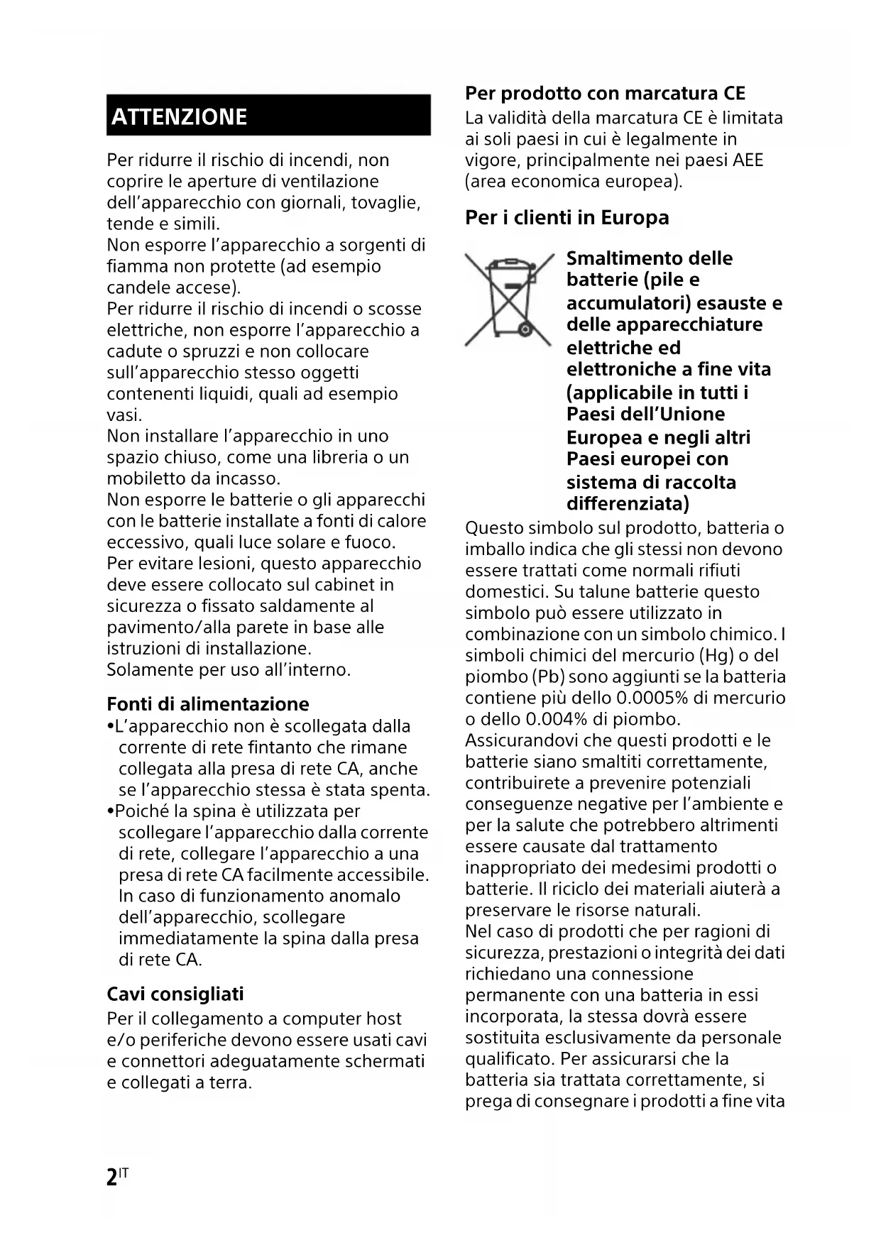 Per ridurre il rischio di incendi, non coprire le aperture di ventilazione dell’apparecchio con giornali, tovaglie, tende e simili. Non esporre l’apparecchio a sorgenti di fiamma non protette (ad esempio candele accese). Per ridurre il rischio di incendi o scosse elettriche, non esporre l’apparecchio a cadute o spruzzi e non collocare sull’apparecchio stesso oggetti contenenti liquidi, quali ad esempio vasi. Non installare l’apparecchio in uno spazio chiuso, come una libreria o un mobiletto da incasso. Non esporre le batterie o gli apparecchi con le batterie installate a fonti di calore eccessivo, quali luce solare e fuoco. Per evitare lesioni, questo apparecchio deve essere collocato sul cabinet in sicurezza o fissato saldamente al pavimento/alla parete in base alle istruzioni di installazione. Solamente per uso all’interno. Fonti di alimentazione L’apparecchio non è scollegata dalla corrente di rete fintanto che rimane collegata alla presa di rete CA, anche se l’apparecchio stessa è stata spenta. Poiché la spina è utilizzata per scollegare l’apparecchio dalla corrente di rete, collegare l’apparecchio a una presa di rete CA facilmente accessibile. In caso di funzionamento anomalo dell’apparecchio, scollegare immediatamente la spina dalla presa di rete CA. Cavi consigliati Per il collegamento a computer host e/o periferiche devono essere usati cavi e connettori adeguatamente schermati e collegati a terra. Per prodotto con marcatura CE La validità della marcatura CE è limitata ai soli paesi in cui è legalmente in vigore, principalmente nei paesi AEE (area economica europea). Per i clienti in Europa Smaltimento delle batterie (pile e accumulatori) esauste e delle apparecchiature elettriche ed elettroniche a fine vita (applicabile in tutti i Paesi dell’Unione Europea e negli altri Paesi europei con sistema di raccolta differenziata) Questo simbolo sul prodotto, batteria o imballo indica che gli stessi non devono essere trattati come normali rifiuti domestici. Su talune batterie questo simbolo può essere utilizzato in combinazione con un simbolo chimico. I simboli chimici del mercurio (Hg) o del piombo (Pb) sono aggiunti se la batteria contiene più dello 0.0005% di mercurio o dello 0.004% di piombo. Assicurandovi che questi prodotti e le batterie siano smaltiti correttamente, contribuirete a prevenire potenziali conseguenze negative per l’ambiente e per la salute che potrebbero altrimenti essere causate dal trattamento inappropriato dei medesimi prodotti o batterie. Il riciclo dei materiali aiuterà a preservare le risorse naturali. Nel caso di prodotti che per ragioni di sicurezza, prestazioni o integrità dei dati richiedano una connessione permanente con una batteria in essi incorporata, la stessa dovrà essere sostituita esclusivamente da personale qualificato. Per assicurarsi che la batteria sia trattata correttamente, si prega di consegnare i prodotti a fine vita ATTENZIONE3