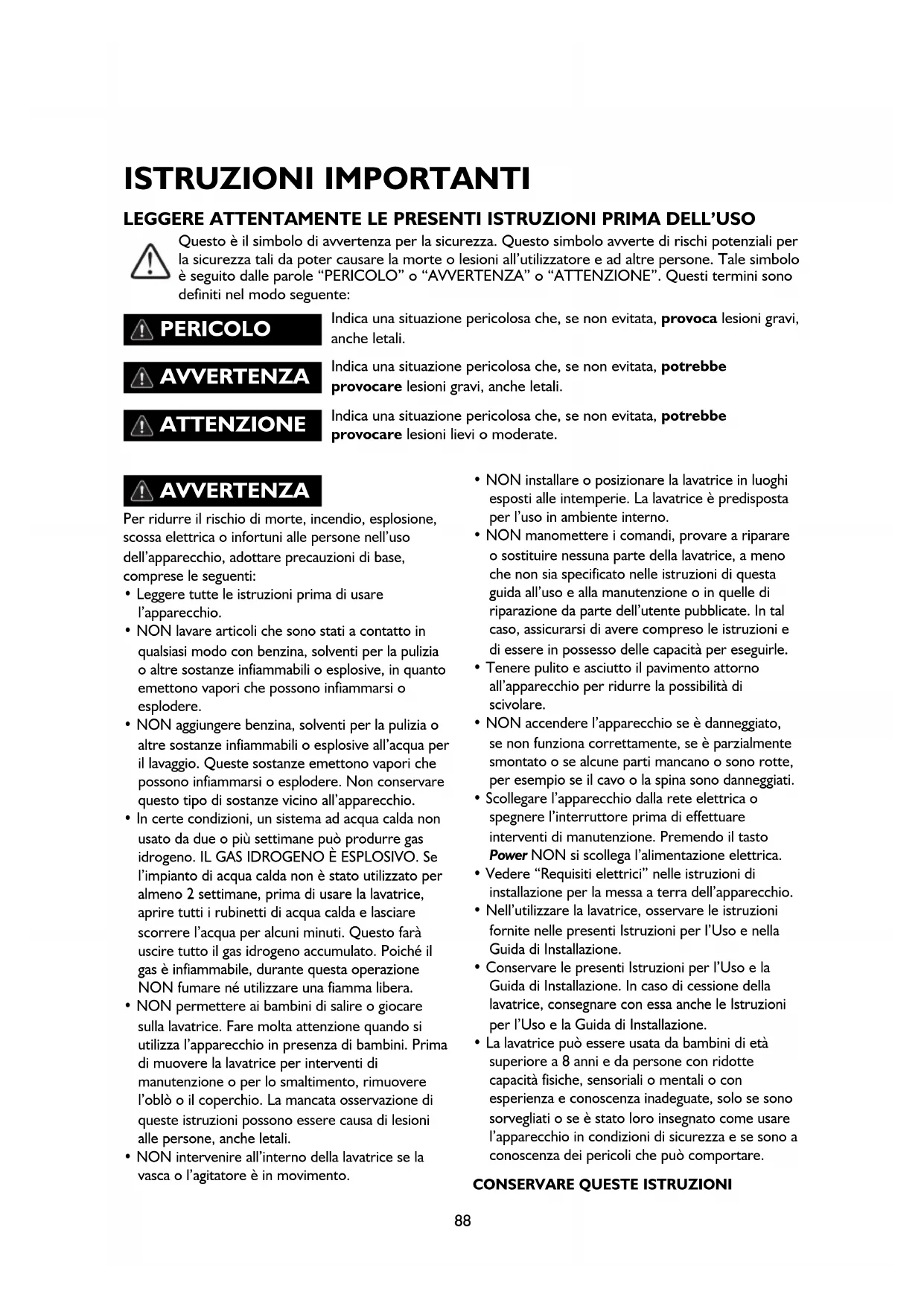 - Asegúrese de que la tapa del suavizante y la lejía está bien colocada. De lo contrario, no funcionará.88 LEGGERE ATTENTAMENTE LE PRESENTI ISTRUZIONI PRIMA DELL’USO Questo è il simbolo di avvertenza per la sicurezza. Questo simbolo avverte di rischi potenziali per la sicurezza tali da poter causare la morte o lesioni all’utilizzatore e ad altre persone. Tale simbolo è seguito dalle parole “PERICOLO” o “AVVERTENZA” o “ATTENZIONE”. Questi termini sono definiti nel modo seguente: Indica una situazione pericolosa che, se non evitata, provoca lesioni gravi, anche letali. Indica una situazione pericolosa che, se non evitata, potrebbe provocare lesioni gravi, anche letali. Indica una situazione pericolosa che, se non evitata, potrebbe provocare lesioni lievi o moderate. ATTENZIONE AVVERTENZA PERICOLO ISTRUZIONI IMPORTANTI Per ridurre il rischio di morte, incendio, esplosione, scossa elettrica o infortuni alle persone nell’uso dell’apparecchio, adottare precauzioni di base, comprese le seguenti: