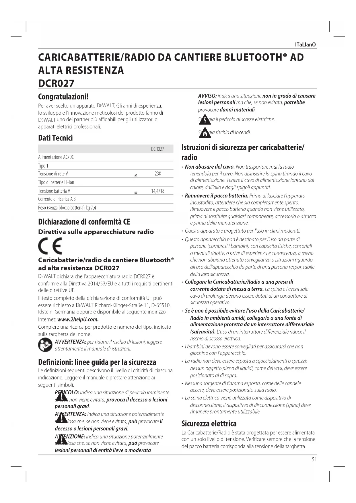 Scocca di sicurezza Utilizzo Previsto La Caricabatterie/Radio da cantiere Bluetooth® è una radio FM. La Caricabatterie/Radio DCR027 può essere alimentata da una fonte di alimentazione da 230 V c.a. e da tutte le batterie agli ioni di litio da 14,4 V, 18 V e 54 V DeWALT . Le batterie sono venduteseparatamente. nOn utilizzare in condizioni di bagnato o in presenza di liquidi o gasinfiammabili. nOn PERMETTERE ai bambini di avvicinarsi all’apparato. Le persone inesperte devono utilizzare questo apparato solo sottosorveglianza.