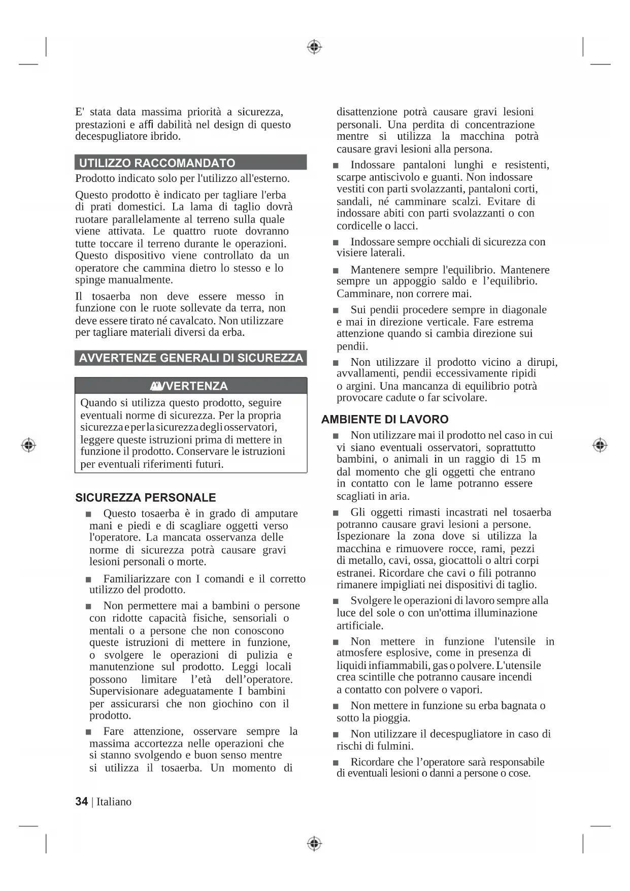 TRE' stata data massima priorità a sicurezza, prestazioni e affi dabilità nel design di questo decespugliatore ibrido. UTILIZZO RACCOMANDATO Prodotto indicato solo per l'utilizzo all'esterno. Questo prodotto è indicato per tagliare l'erba di prati domestici. La lama di taglio dovrà ruotare parallelamente al terreno sulla quale viene attivata. Le quattro ruote dovranno tutte toccare il terreno durante le operazioni. Questo dispositivo viene controllato da un operatore che cammina dietro lo stesso e lo spinge manualmente. Il tosaerba non deve essere messo in funzione con le ruote sollevate da terra, non deve essere tirato né cavalcato. Non utilizzare per tagliare materiali diversi da erba.