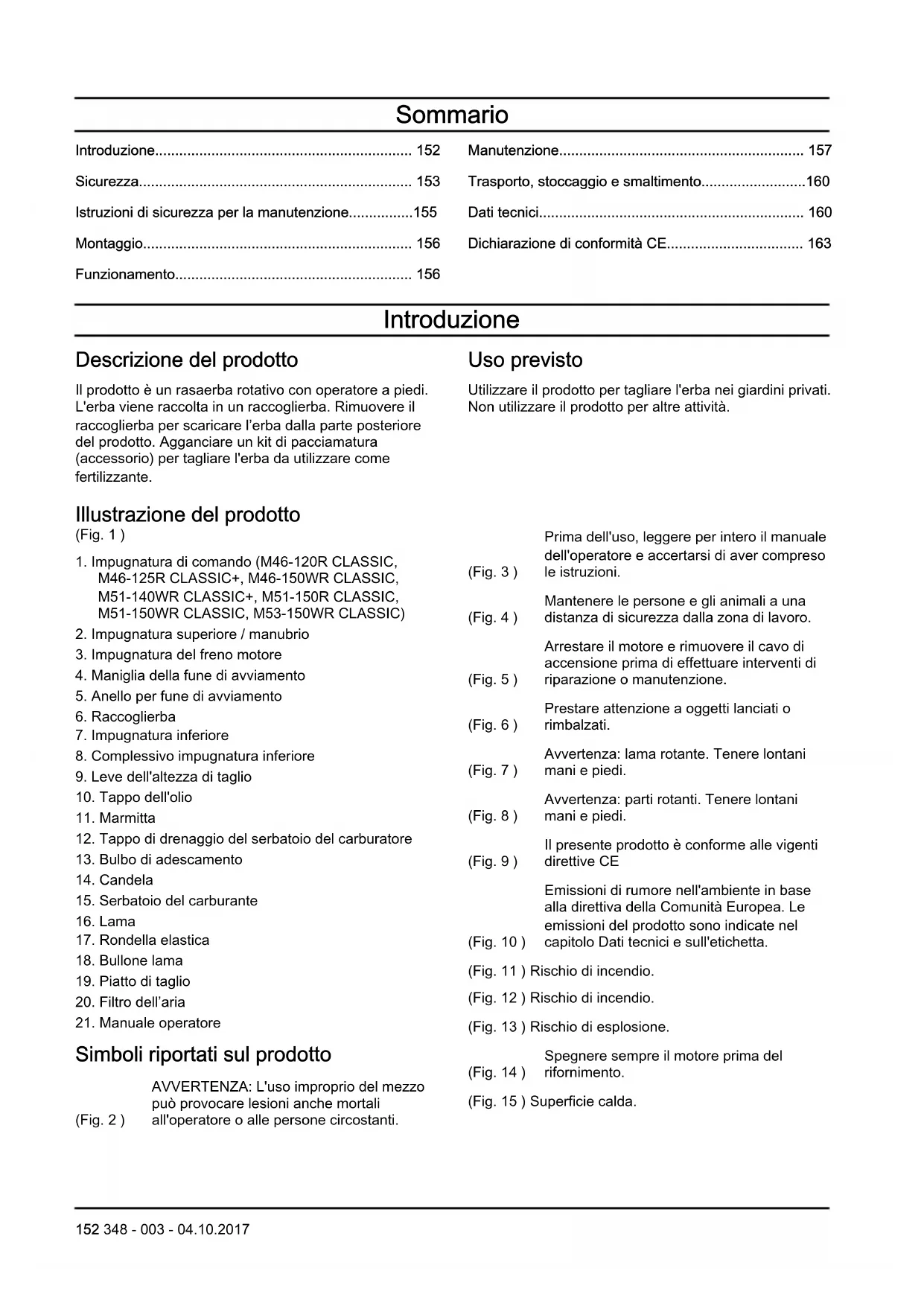 Simboli riportati sul prodotto (Fig. 2 ) AVVERTENZA: L'uso improprio del mezzo può provocare lesioni anche mortali all'operatore o alle persone circostanti. (Fig. 3 ) Prima dell'uso, leggere per intero il manuale dell'operatore e accertarsi di aver compreso le istruzioni. (Fig. 4 ) Mantenere le persone e gli animali a una distanza di sicurezza dalla zona di lavoro. (Fig. 5 ) Arrestare il motore e rimuovere il cavo di accensione prima di effettuare interventi di riparazione o manutenzione. (Fig. 6 ) Prestare attenzione a oggetti lanciati o rimbalzati. (Fig. 7 ) Avvertenza: lama rotante. Tenere lontani mani e piedi. (Fig. 8 ) Avvertenza: parti rotanti. Tenere lontani mani e piedi. (Fig. 9 ) Il presente prodotto è conforme alle vigenti direttive CE (Fig. 10 ) Emissioni di rumore nell'ambiente in base alla direttiva della Comunità Europea. Le emissioni del prodotto sono indicate nel capitolo Dati tecnici e sull'etichetta. (Fig. 11 ) Rischio di incendio. (Fig. 12 ) Rischio di incendio. (Fig. 13 ) Rischio di esplosione. (Fig. 14 ) Spegnere sempre il motore prima del rifornimento. (Fig. 15 ) Superficie calda. 152 348 - 003 - 04.10.2017(Fi g. 16 ) I fumi di scarico del motore con- tengono monossido di carbonio, un gas inodore, velenoso e alta- mente pericoloso. Non far fun- zionare il prodotto in ambienti chiusi o in spazi angusti. Nota: I restanti simboli/decalcomanie sul prodotto riguardano particolari requisiti necessari per ottenere la certificazione in altre aree commerciali. Responsabilità del prodotto Come indicato nelle leggi vigenti in materia di responsabilità obbligatoria sul prodotto, non siamo responsabili per eventuali danni causati dal nostro prodotto se: