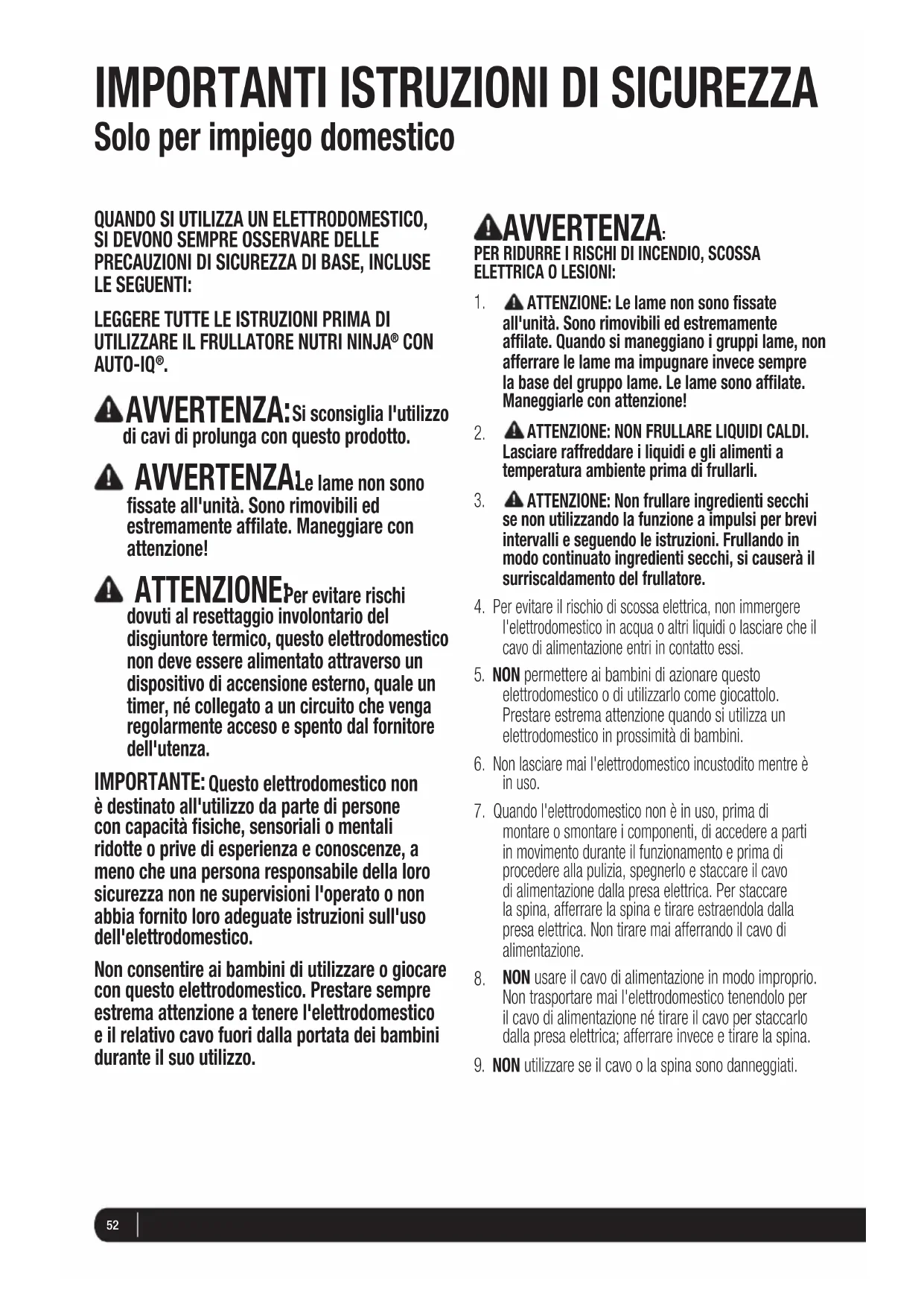 QUANDO SI UTILIZZA L'ELETTRODOMESTICO: AVVERTENZA: Non lasciare mai l'elettrodomestico incustodito mentre è in uso. ATTENZIONE: Non frullare liquidi caldi. Lasciare raffreddare i liquidi e gli alimenti a temperatura ambiente prima di frullarli. ATTENZIONE: Le lame sono affilate! Usare estrema cautela quando si maneggiano i gruppi lame. Tenerli sempre per la base del gruppo lame. ATTENZIONE: Non rimuovere mai il contenitore mentre l'elettrodomestico è ancora in funzione. ATTENZIONE: Sconsigliamo di utilizzare le tazze Nutri Ninja
