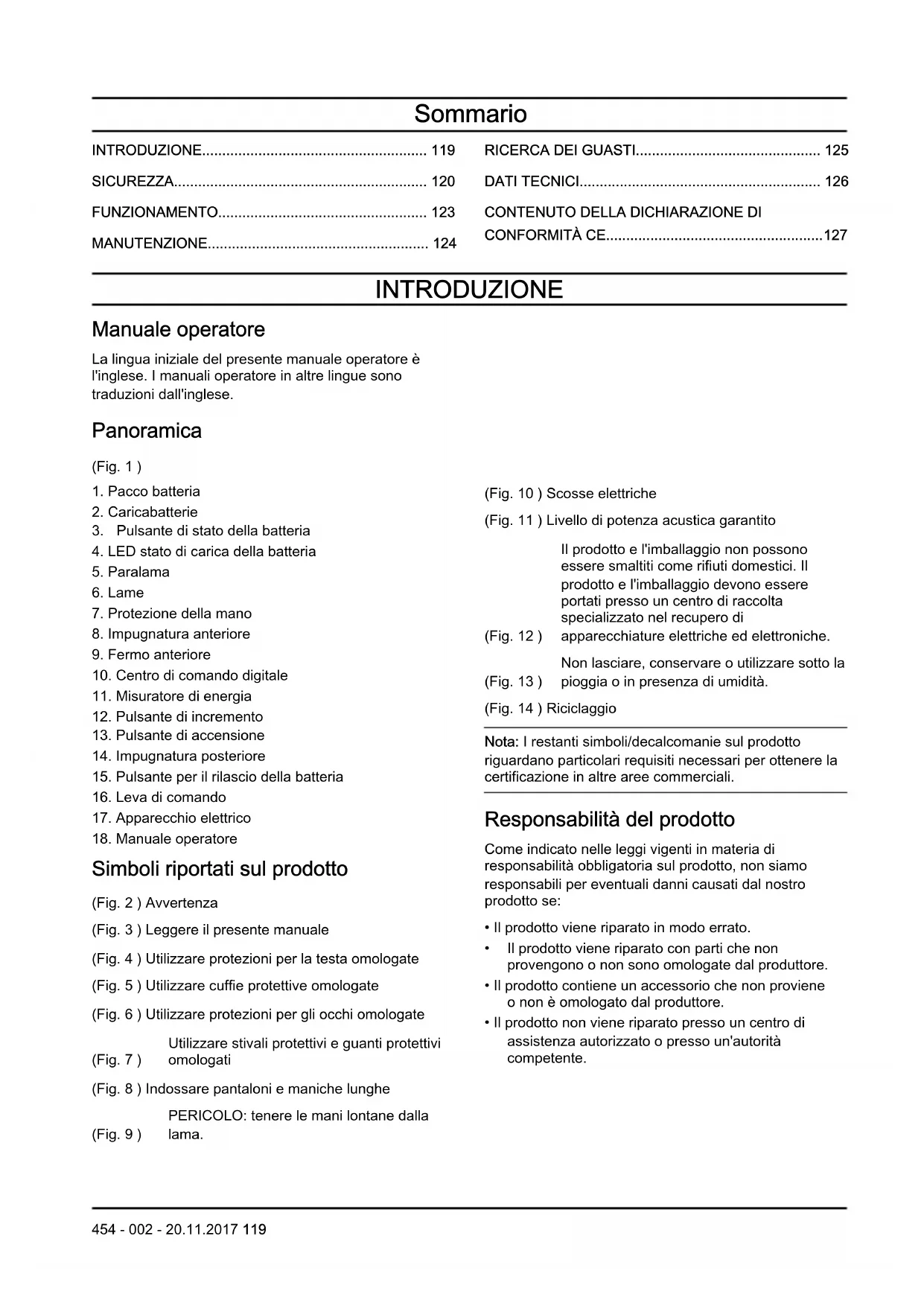 Simboli riportati sul prodotto (Fig. 2 ) Avvertenza (Fig. 3 ) Leggere il presente manuale (Fig. 4 ) Utilizzare protezioni per la testa omologate (Fig. 5 ) Utilizzare cuffie protettive omologate (Fig. 6 ) Utilizzare protezioni per gli occhi omologate (Fig. 7 ) Utilizzare stivali protettivi e guanti protettivi omologati (Fig. 8 ) Indossare pantaloni e maniche lunghe (Fig. 9 ) PERICOLO: tenere le mani lontane dalla lama. (Fig. 10 ) Scosse elettriche (Fig. 11 ) Livello di potenza acustica garantito (Fig. 12 ) Il prodotto e l'imballaggio non possono essere smaltiti come rifiuti domestici. Il prodotto e l'imballaggio devono essere portati presso un centro di raccolta specializzato nel recupero di apparecchiature elettriche ed elettroniche. (Fig. 13 ) Non lasciare, conservare o utilizzare sotto la pioggia o in presenza di umidità. (Fig. 14 ) Riciclaggio Nota: I restanti simboli/decalcomanie sul prodotto riguardano particolari requisiti necessari per ottenere la certificazione in altre aree commerciali. Responsabilità del prodotto Come indicato nelle leggi vigenti in materia di responsabilità obbligatoria sul prodotto, non siamo responsabili per eventuali danni causati dal nostro prodotto se: