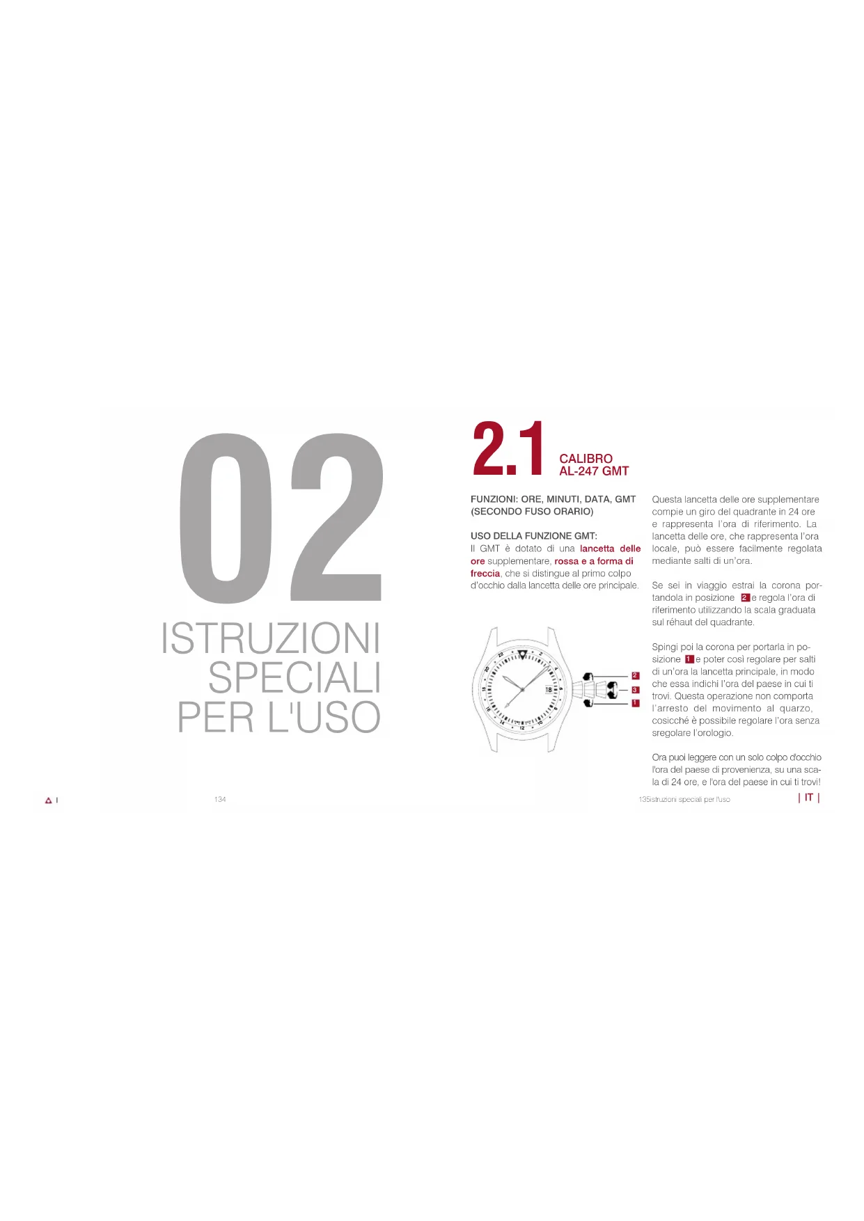 136 | IT | FUNZIONI: ORE, MINUTI, SECONDI, DATA, GMT (SECONDO FUSO ORARIO) USO DELLA FUNZIONE GMT: Il GMT è dotato di una lancetta delle ore supplementare, rossa e a forma di freccia, che si distingue al primo colpo d’occhio dalla lancetta delle ore principale. Questa lancetta delle ore supplementare compie un giro del quadrante in 24 ore e rappresenta l’ora di riferimento. La lancetta delle ore, che rappresenta l’ora locale, può essere facilmente regolata mediante salti di un’ora. Se sei in viaggio estrai la corona por- tandola in posizione