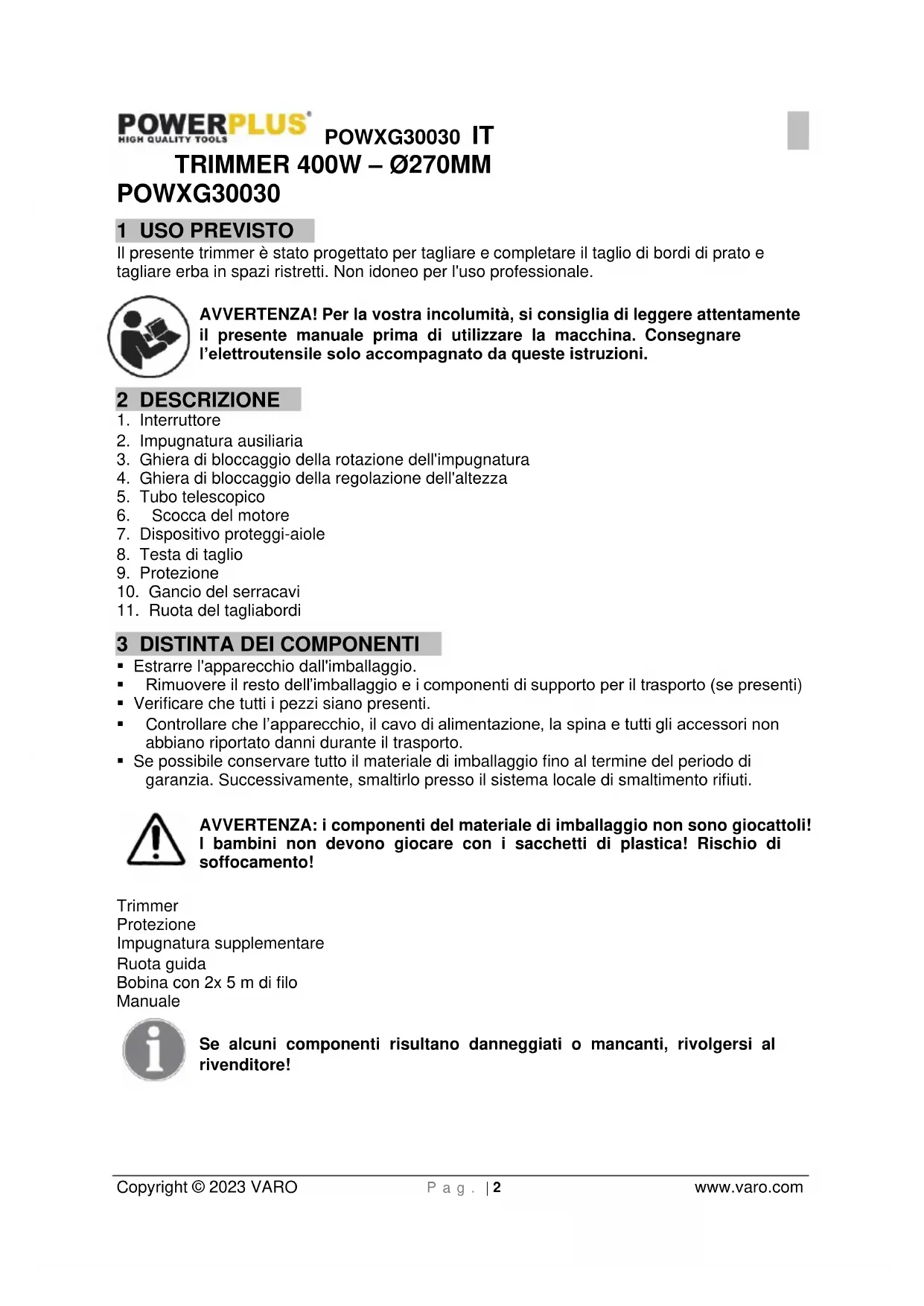 - Non toccare il filo di taglio.POWXG30030 IT Copyright © 2023 VARO P a g . | 6 www.varo.com