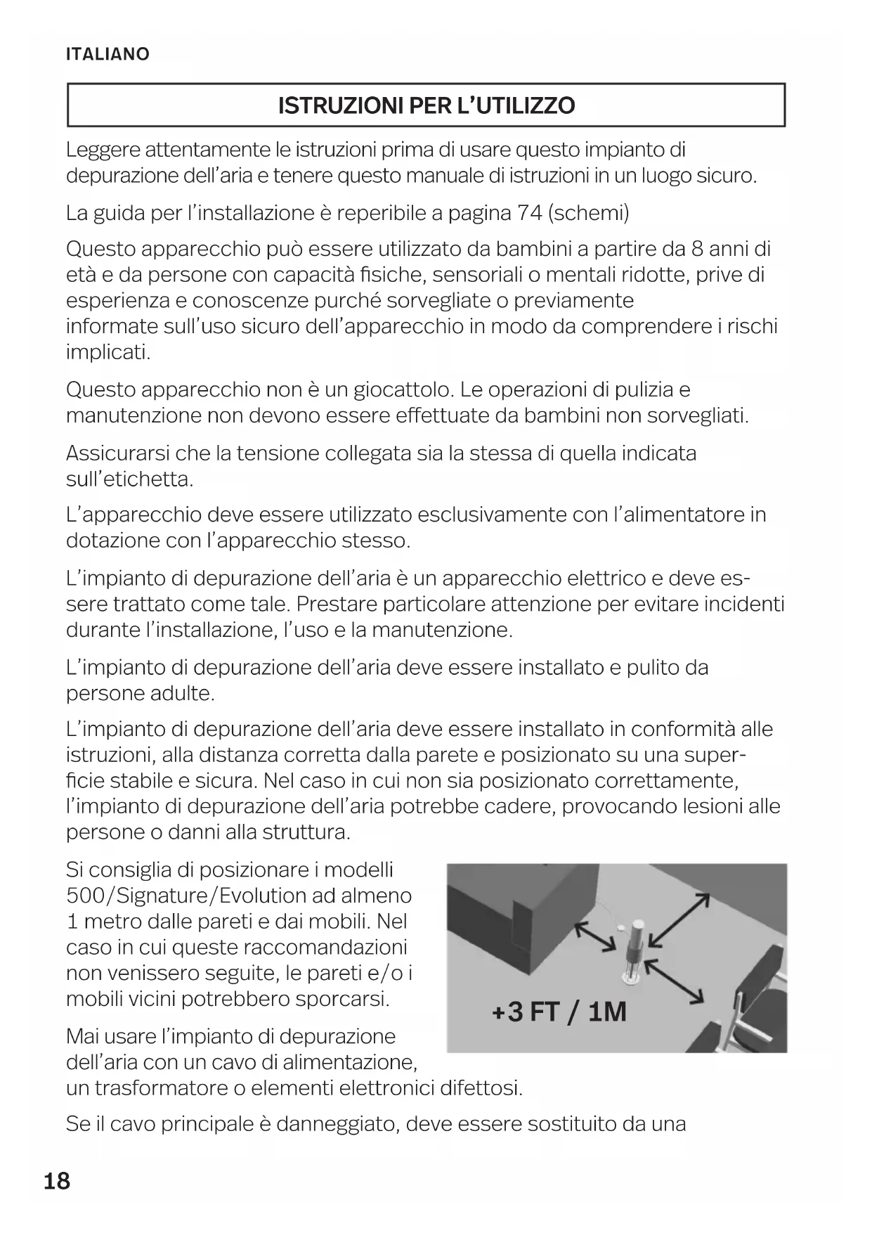 Leggere attentamente le istruzioni prima di usare questo impianto di depurazione dell’aria e tenere questo manuale di istruzioni in un luogo sicuro. La guida per l’installazione è reperibile a pagina 74 (schemi) Questo apparecchio può essere utilizzato da bambini a partire da 8 anni di età e da persone con capacità siche, sensoriali o mentali ridotte, prive di esperienza e conoscenze purché sorvegliate o previamente informate sull’uso sicuro dell’apparecchio in modo da comprendere i rischi implicati. Questo apparecchio non è un giocattolo. Le operazioni di pulizia e manutenzione non devono essere effettuate da bambini non sorvegliati. Assicurarsi che la tensione collegata sia la stessa di quella indicata sull’etichetta. L’apparecchio deve essere utilizzato esclusivamente con l’alimentatore in dotazione con l’apparecchio stesso. L’impianto di depurazione dell’aria è un apparecchio elettrico e deve es- sere trattato come tale. Prestare particolare attenzione per evitare incidenti durante l’installazione, l’uso e la manutenzione. L’impianto di depurazione dell’aria deve essere installato e pulito da persone adulte. L’impianto di depurazione dell’aria deve essere installato in conformità alle istruzioni, alla distanza corretta dalla parete e posizionato su una super- cie stabile e sicura. Nel caso in cui non sia posizionato correttamente, l’impianto di depurazione dell’aria potrebbe cadere, provocando lesioni alle persone o danni alla struttura. Si consiglia di posizionare i modelli 500/Signature/Evolution ad almeno 1 metro dalle pareti e dai mobili. Nel caso in cui queste raccomandazioni non venissero seguite, le pareti e/o i mobili vicini potrebbero sporcarsi. Mai usare l’impianto di depurazione dell’aria con un cavo di alimentazione, un trasformatore o elementi elettronici difettosi. Se il cavo principale è danneggiato, deve essere sostituito da una ITALIANO +3 FT / 1M19 persona qualicata. Per evitare folgorazioni, incendi, lesioni personali o altri pericoli, non immergere l’impianto di depurazione dell’aria, compreso il trasformatore, in acqua o in altri liquidi. Non posizionare l’impianto di depurazione dell’aria o il cavo vicino a una fonte di calore. Non usare l’impianto di puricazione dell’aria all’esterno. Non usare l’impianto di puricazione dell’aria instanze umide. Non usare l’impianto di depurazione dell’aria unitamente a candele colorate o a base di olio, poiché queste emettono fuliggine che può attaccarsi alle pareti e ai mobili. Nel toccare il collettore, potrebbe essere emessa una piccola scarica elettrica innoqua. Se si desidera eliminare la scarica, scollegare ilc- dispositivo prima di manipolarlo e utilizzare la protezione quando il depura- tore è acceso. La protezione è opzionale e non necessaria dal punto di vista della sicurezza. Nota: LifeAir non può essere ritenuta responsabile per eventuali danni causati come conseguenza del mancato rispetto di queste raccoman- dazioni. ITALIANO20 ITALIANO È NECESSARIO scollegare l’alimentazione e s pegnere l’impianto di depurazione dell’aria prima della pulizia. NON lavare il collettore in lavastoviglie. NON usare prodotti detergenti che contengano soluzioni a base di alcol, ammoniaca o sostan- ze alcaline, poiché questi prodotti potrebbero danneggiare l’impianto di depurazione. Il collettore deve essere pulito all’incirca ogni due settimane o quando necessario. Potrebbe essere necessario pulire il collettore più frequentemente se esso viene utilizzato in ambienti altamente contaminati. Pulizia del collettore: