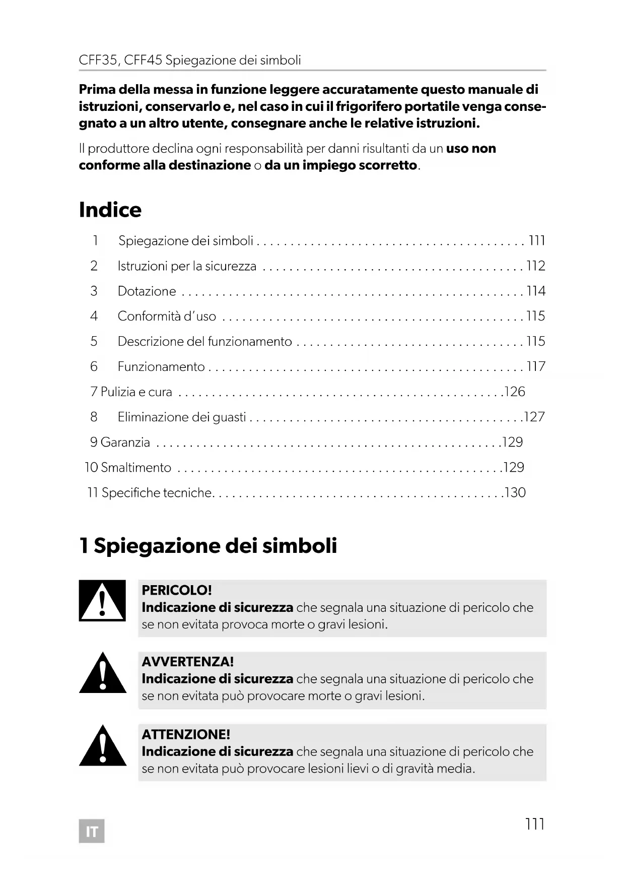 PERICOLO! Indicazione di sicurezza che segnala una situazione di pericolo che se non evitata provoca morte o gravi lesioni. AVVERTENZA! Indicazione di sicurezza che segnala una situazione di pericolo che se non evitata può provocare morte o gravi lesioni. ATTENZIONE! Indicazione di sicurezza che segnala una situazione di pericolo che se non evitata può provocare lesioni lievi o di gravità media. DometicCFF35-45_OPM_4445102909_EMEA16.book Seite 111 Donnerstag, 13. Februar 2020 2:24 14IT Istruzioni per la sicurezza CFF35, CFF45