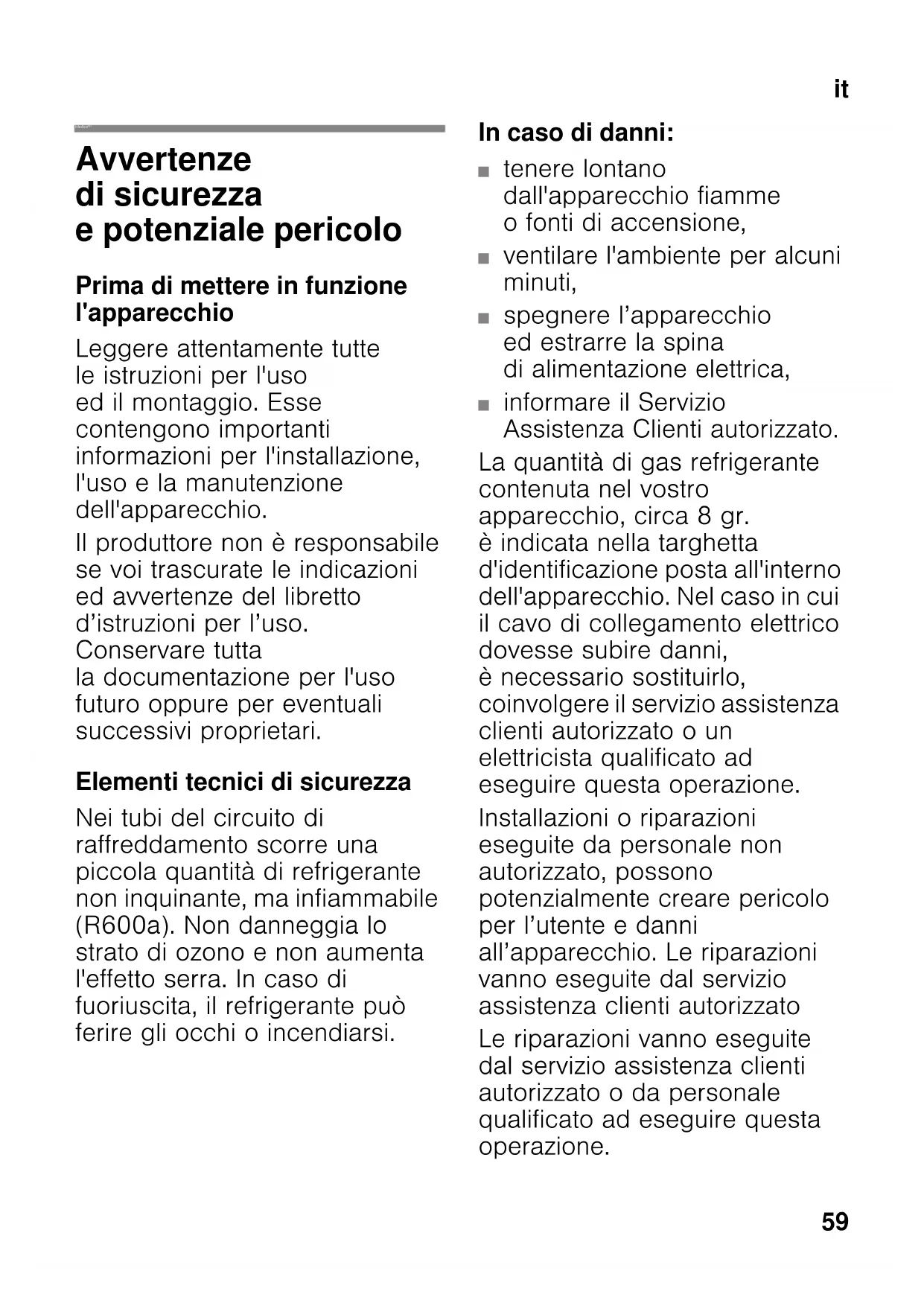 itIndice itIstruzioni per I´uso Avvertenze di sicurezza e potenziale pericolo Prima di mettere in funzione l'apparecchio Leggere attentamente tutte le istruzioni per l'uso ed il montaggio. Esse contengono importanti informazioni per l'installazione, l'uso e la manutenzione dell'apparecchio. Il produttore non è responsabile se voi trascurate le indicazioni ed avvertenze del libretto d’istruzioni per l’uso. Conservare tutta la documentazione per l'uso futuro oppure per eventuali successivi proprietari. Elementi tecnici di sicurezza Nei tubi del circuito di raffreddamento scorre una piccola quantità di refrigerante non inquinante, ma infiammabile (R600a). Non danneggia lo strato di ozono e non aumenta l'effetto serra. In caso di fuoriuscita, il refrigerante può ferire gli occhi o incendiarsi. In caso di danni: ■ tenere lontano dall'apparecchio fiamme o fonti di accensione, ■ ventilare l'ambiente per alcuni minuti, ■ spegnere l’apparecchio ed estrarre la spina di alimentazione elettrica, ■ informare il Servizio Assistenza Clienti autorizzato. La quantità di gas refrigerante contenuta nel vostro apparecchio, circa 8 gr. è indicata nella targhetta d'identificazione posta all'interno dell'apparecchio. Nel caso in cui il cavo di collegamento elettrico dovesse subire danni, è necessario sostituirlo, coinvolgere il servizio assistenza clienti autorizzato o un elettricista qualificato ad eseguire questa operazione. Installazioni o riparazioni eseguite da personale non autorizzato, possono potenzialmente creare pericolo per l’utente e danni all’apparecchio. Le riparazioni vanno eseguite dal servizio assistenza clienti autorizzato Le riparazioni vanno eseguite dal servizio assistenza clienti autorizzato o da personale qualificato ad eseguire questa operazione.it