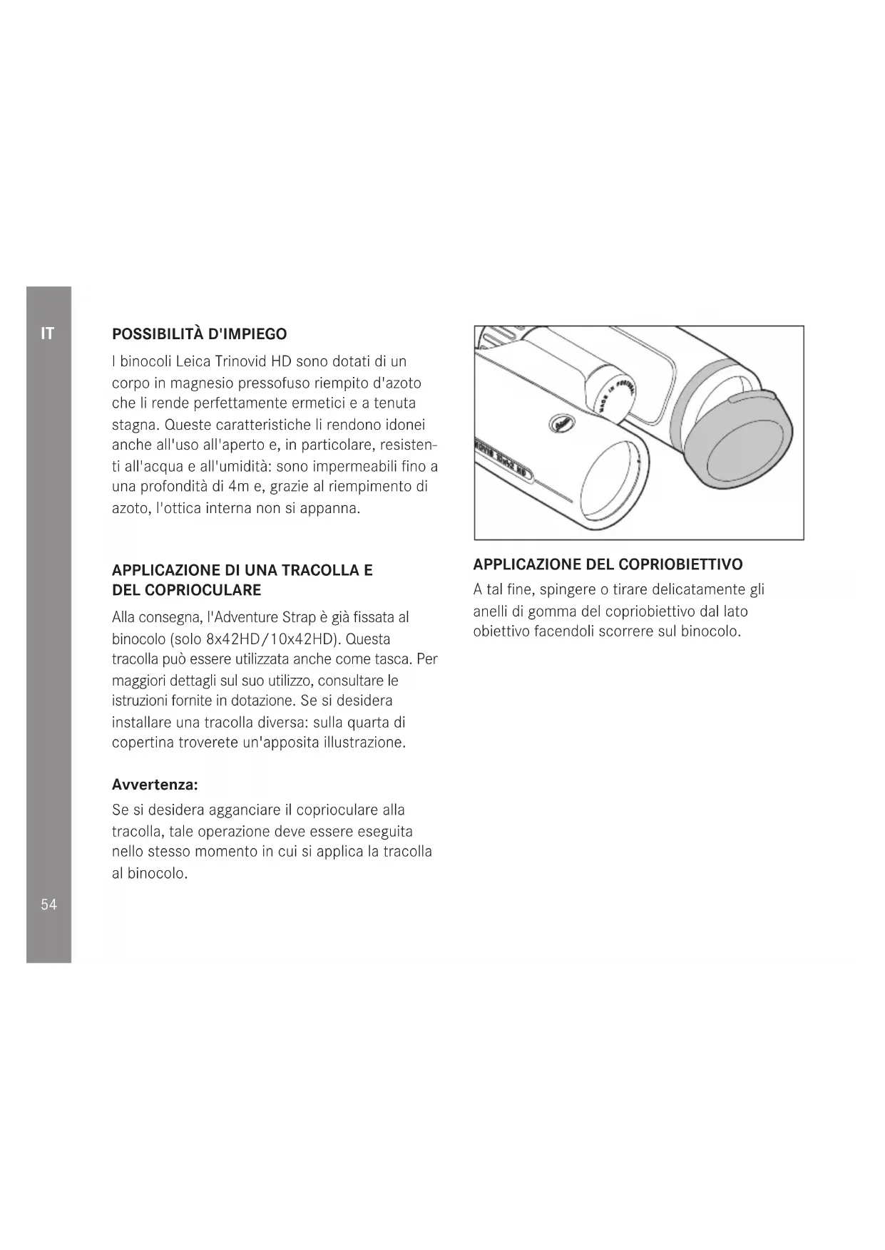 PREFAZIONE Gentile cliente, in tutto il mondo il nome Leica è sinonimo di altissima qualità e precisione meccanica, unite a un'estrema affidabilità e a una lunga durata di vita. Le auguriamo di ottenere il massimo piacere e le migliori soddisfazioni dal suo nuovo binocolo Leica Trinovid HD. Per poter sfruttare pienamen- te tutte le possibilità offerte da questo dispositi- vo, Le consigliamo di leggere attentamente queste istruzioni.