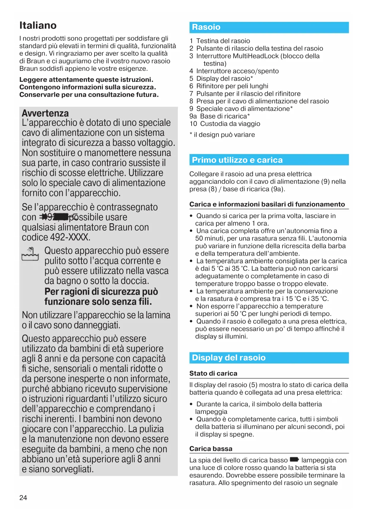 A máquina de barbear desliga-se com a bateria completamente carregada. A rede e o bloco de lâminas estão gastos, o que exige demasiado do motor. O aparelho desliga-se. – Substitua a rede e bloco de lâminas. – Lubrifique regularmente o sistema de corte com óleo, especialmente se utilizar apenas água para o limpar. 91154595_Series_9-2_Solo_Euro_S6-96.indd 23 28.11.16 13:0924 Italiano I nostri prodotti sono progettati per soddisfare gli standard più elevati in termini di qualità, funzionalità e design. Vi ringraziamo per aver scelto la qualità di Braun e ci auguriamo che il vostro nuovo rasoio Braun soddisfi appieno le vostre esigenze. Leggere attentamente queste istruzioni. Contengono informazioni sulla sicurezza. Conservarle per una consultazione futura. Avvertenza L’apparecchio è dotato di uno speciale cavo di alimentazione con un sistema integrato di sicurezza a basso voltaggio. Non sostituire o manomettere nessuna sua parte, in caso contrario sussiste il rischio di scosse elettriche. Utilizzare solo lo speciale cavo di alimentazione fornito con l’apparecchio. Se l’apparecchio è contrassegnato con 492, è possibile usare qualsiasi alimentatore Braun con codice 492-XXXX. Questo apparecchio può essere pulito sotto l’acqua corrente e può essere utilizzato nella vasca da bagno o sotto la doccia. Per ragioni di sicurezza può funzionare solo senza fili. Non utilizzare l’apparecchio se la lamina o il cavo sono danneggiati. Questo apparecchio può essere utilizzato da bambini di età superiore agli 8 anni e da persone con capacità fi siche, sensoriali o mentali ridotte o da persone inesperte o non informate, purché abbiano ricevuto supervisione o istruzioni riguardanti l’utilizzo sicuro dell’apparecchio e comprendano i rischi inerenti. I bambini non devono giocare con l’apparecchio. La pulizia e la manutenzione non devono essere eseguite da bambini, a meno che non abbiano un’età superiore agli 8 anni e siano sorvegliati. Rasoio 1 Testina del rasoio 2 Pulsante di rilascio della testina del rasoio 3 Interruttore MultiHeadLock (blocco della testina) 4 Interruttore acceso/spento 5 Display del rasoio* 6 Rifinitore per peli lunghi 7 Pulsante per il rilascio del rifinitore 8 Presa per il cavo di alimentazione del rasoio 9 Speciale cavo di alimentazione* 9a Base di ricarica* 10 Custodia da viaggio