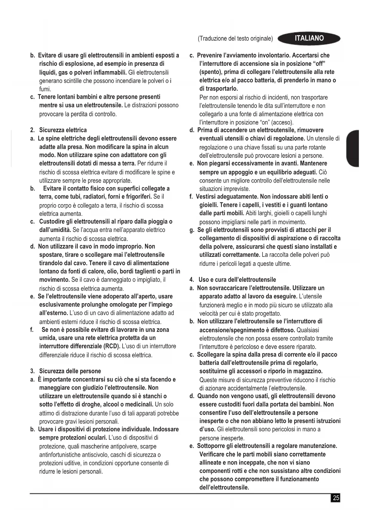 a. Mantenere pulita e bene illuminata la zona di lavoro. Gli ambienti disordinati o scarsamente illuminati favoriscono gli incidenti.25 (Traduzione del testo originale) ITALIANO b. Evitare di usare gli elettroutensili in ambienti esposti a rischio di esplosione, ad esempio in presenza di liquidi,gasopolveriinammabili. Gli elettroutensili generano scintille che possono incendiare le polveri o i fumi. c. Tenere lontani bambini e altre persone presenti mentre si usa un elettroutensile. Le distrazioni possono provocare la perdita di controllo.