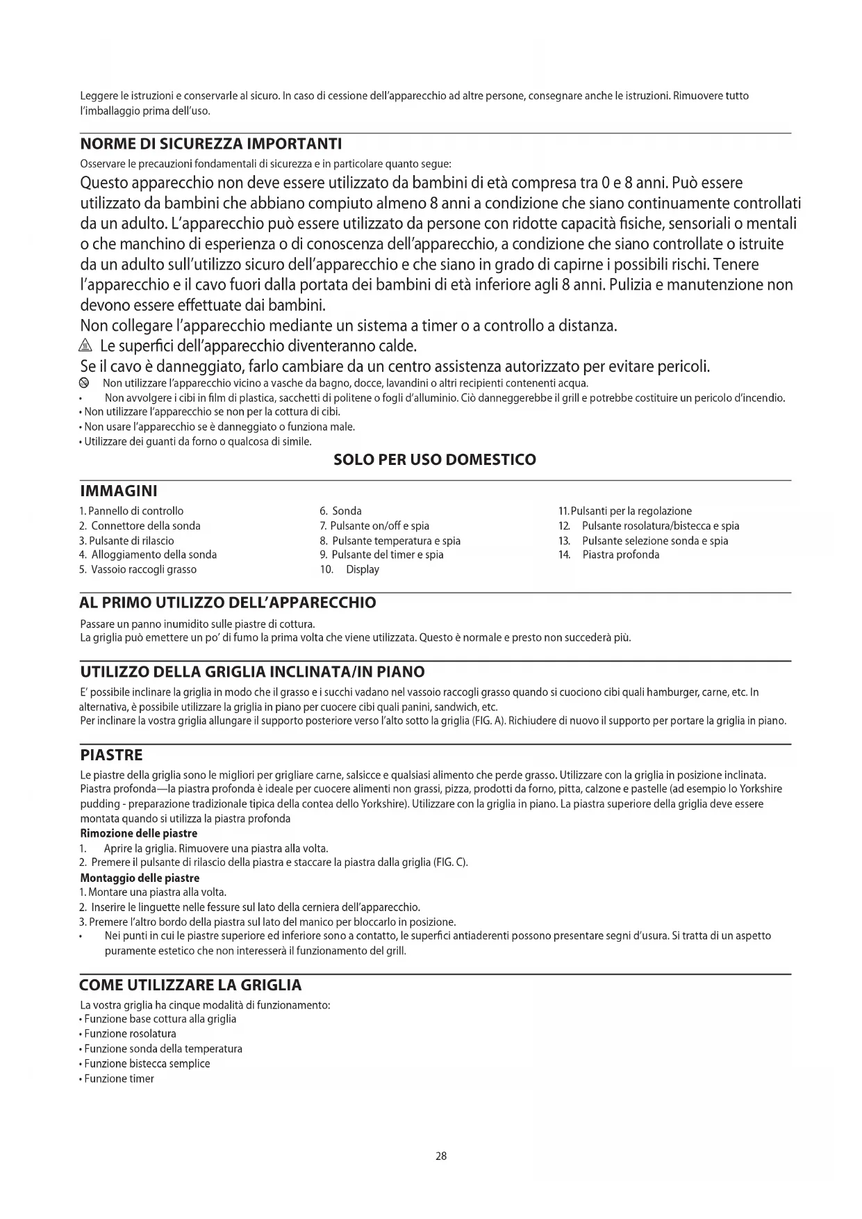 E’ possibile inclinare la griglia in modo che il grasso e i succhi vadano nel vassoio raccogli grasso quando si cuociono cibi quali hamburger, carne, etc. In alternativa, è possibile utilizzare la griglia in piano per cuocere cibi quali panini, sandwich, etc. Per inclinare la vostra griglia allungare il supporto posteriore verso l’alto sotto la griglia (FIG. A). Richiudere di nuovo il supporto per portare la griglia in piano. PIASTRE Le piastre della griglia sono le migliori per grigliare carne, salsicce e qualsiasi alimento che perde grasso. Utilizzare con la griglia in posizione inclinata. Piastra profonda—la piastra profonda è ideale per cuocere alimenti non grassi, pizza, prodotti da forno, pitta, calzone e pastelle (ad esempio lo Yorkshire pudding - preparazione tradizionale tipica della contea dello Yorkshire). Utilizzare con la griglia in piano. La piastra superiore della griglia deve essere montata quando si utilizza la piastra profonda Rimozione delle piastre