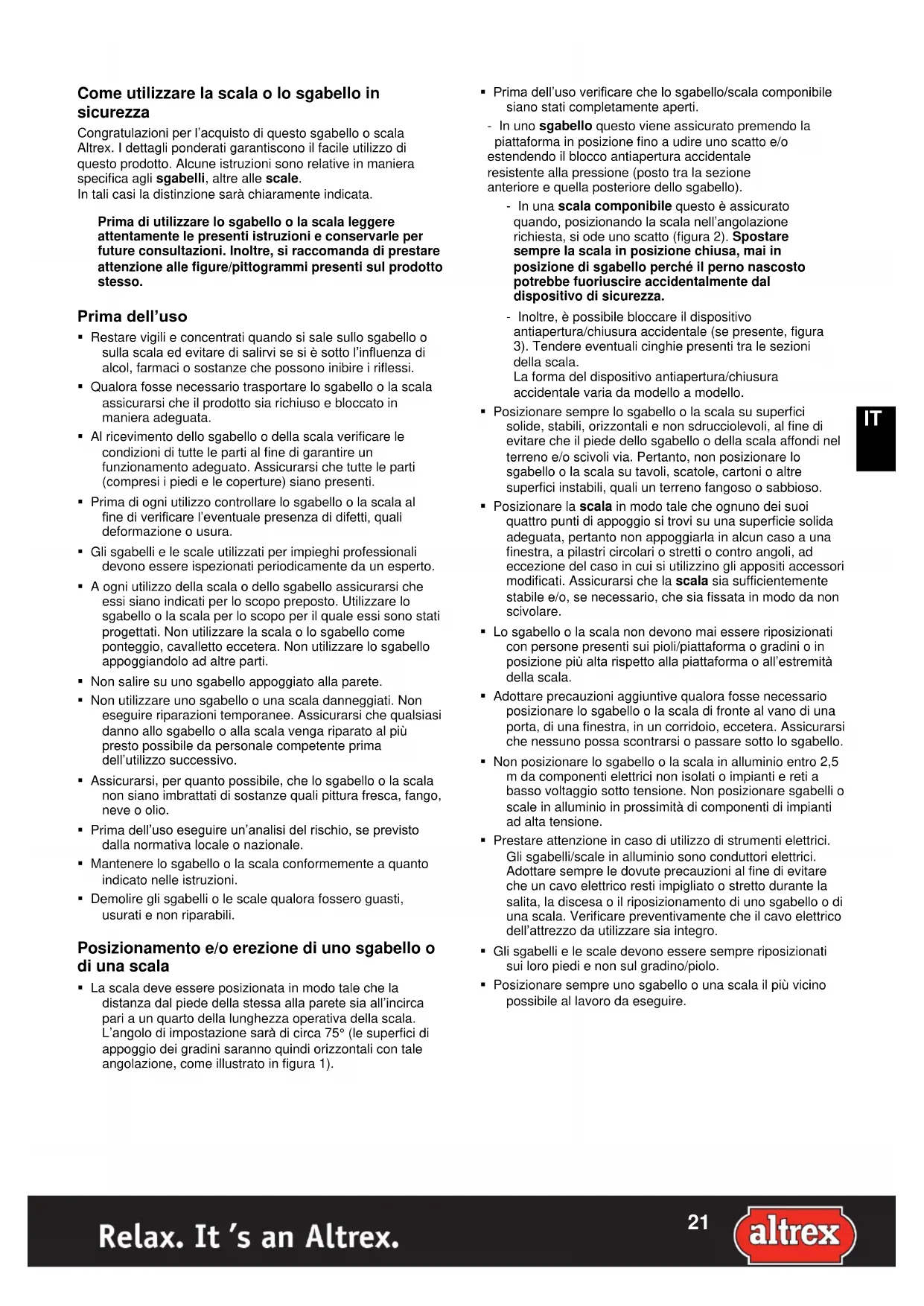 Come utilizzare la scala o lo sgabello in sicurezza Congratulazioni per l‟acquisto di questo sgabello o scala Altrex. I dettagli ponderati garantiscono il facile utilizzo di questo prodotto. Alcune istruzioni sono relative in maniera specifica agli sgabelli, altre alle scale. In tali casi la distinzione sarà chiaramente indicata. Prima di utilizzare lo sgabello o la scala leggere attentamente le presenti istruzioni e conservarle per future consultazioni. Inoltre, si raccomanda di prestare attenzione alle figure/pittogrammi presenti sul prodotto stesso. Prima dell’uso Restare vigili e concentrati quando si sale sullo sgabello o sulla scala ed evitare di salirvi se si è sotto l‟influenza di alcol, farmaci o sostanze che possono inibire i riflessi. Qualora fosse necessario trasportare lo sgabello o la scala assicurarsi che il prodotto sia richiuso e bloccato in maniera adeguata. Al ricevimento dello sgabello o della scala verificare le condizioni di tutte le parti al fine di garantire un funzionamento adeguato. Assicurarsi che tutte le parti (compresi i piedi e le coperture) siano presenti. Prima di ogni utilizzo controllare lo sgabello o la scala al fine di verificare l‟eventuale presenza di difetti, quali deformazione o usura. Gli sgabelli e le scale utilizzati per impieghi professionali devono essere ispezionati periodicamente da un esperto. A ogni utilizzo della scala o dello sgabello assicurarsi che essi siano indicati per lo scopo preposto. Utilizzare lo sgabello o la scala per lo scopo per il quale essi sono stati progettati. Non utilizzare la scala o lo sgabello come ponteggio, cavalletto eccetera. Non utilizzare lo sgabello appoggiandolo ad altre parti. Non salire su uno sgabello appoggiato alla parete. Non utilizzare uno sgabello o una scala danneggiati. Non eseguire riparazioni temporanee. Assicurarsi che qualsiasi danno allo sgabello o alla scala venga riparato al più presto possibile da personale competente prima dell‟utilizzo successivo. Assicurarsi, per quanto possibile, che lo sgabello o la scala non siano imbrattati di sostanze quali pittura fresca, fango, neve o olio. Prima dell‟uso eseguire un‟analisi del rischio, se previsto dalla normativa locale o nazionale. Mantenere lo sgabello o la scala conformemente a quanto indicato nelle istruzioni. Demolire gli sgabelli o le scale qualora fossero guasti, usurati e non riparabili. Posizionamento e/o erezione di uno sgabello o di una scala La scala deve essere posizionata in modo tale che la distanza dal piede della stessa alla parete sia all‟incirca pari a un quarto della lunghezza operativa della scala. L‟angolo di impostazione sarà di circa 75° (le superfici di appoggio dei gradini saranno quindi orizzontali con tale angolazione, come illustrato in figura 1).