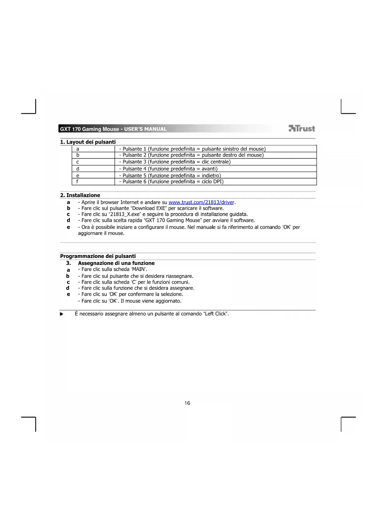 - Aprire il browser Internet e andare su www.trust.com/21813/driver. - Fare clic sul pulsante “Download EXE” per scaricare il software. - Fare clic su “21813_X.exe” e seguire la procedura di installazione guidata. - Fare clic sulla scelta rapida “GXT 170 Gaming Mouse” per avviare il software. - Ora è possibile iniziare a configurare il mouse. Nel manuale si fa riferimento al comando ‘OK’ per aggiornare il mouse.