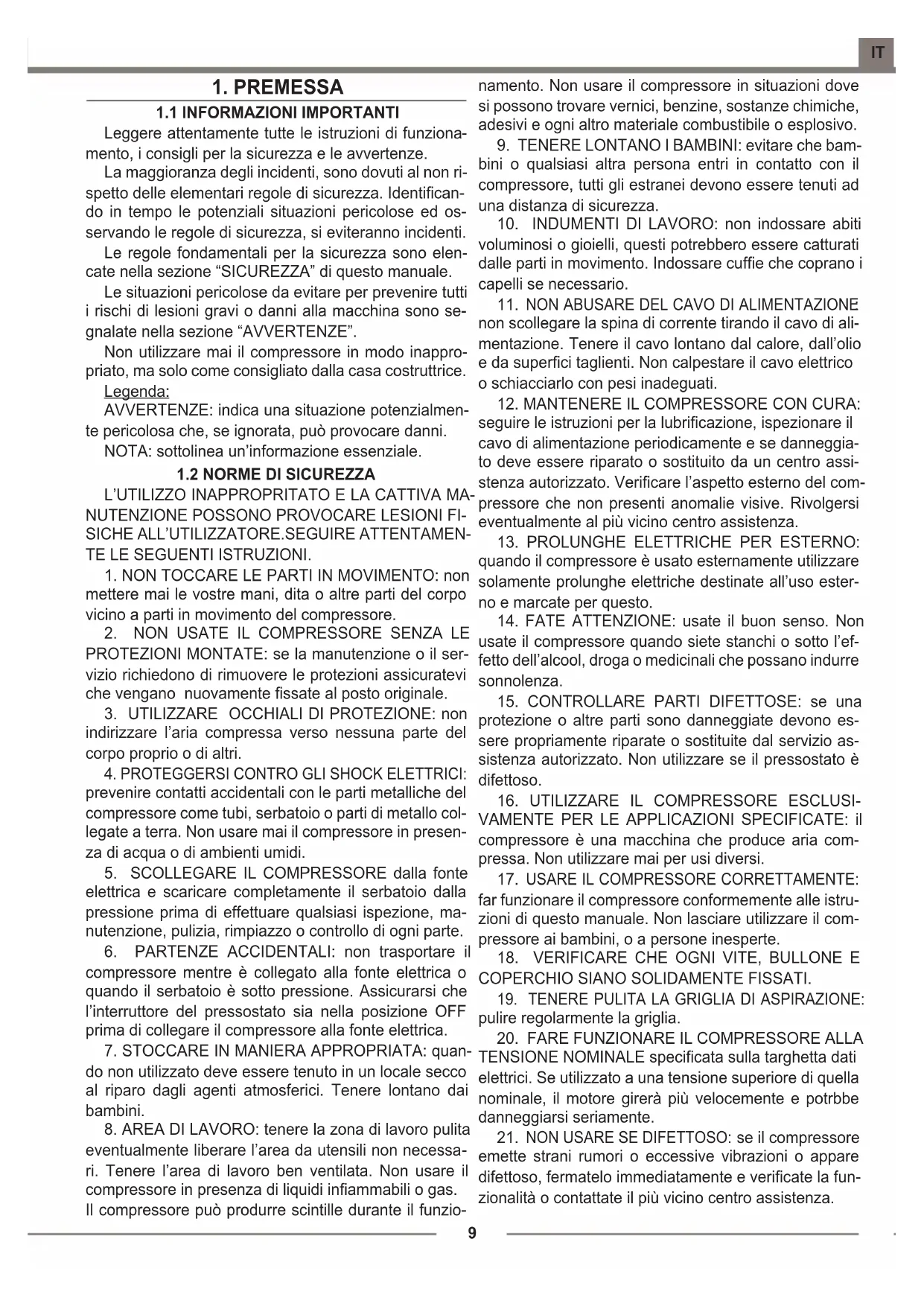 mento, i consigli per la sicurezza e le avvertenze. La maggioranza degli incidenti, sono dovuti al non ri- spetto delle elementari regole di sicurezza. Identican- do in tempo le potenziali situazioni pericolose ed os- servando le regole di sicurezza, si eviteranno incidenti. Le regole fondamentali per la sicurezza sono elen- cate nella sezione “SICUREZZA” di questo manuale. Le situazioni pericolose da evitare per prevenire tutti i rischi di lesioni gravi o danni alla macchina sono se- gnalate nella sezione “AVVERTENZE”. Non utilizzare mai il compressore in modo inappro- priato, ma solo come consigliato dalla casa costruttrice. Legenda: AVVERTENZE: indica una situazione potenzialmen- te pericolosa che, se ignorata, può provocare danni. NOTA: sottolinea un’informazione essenziale.