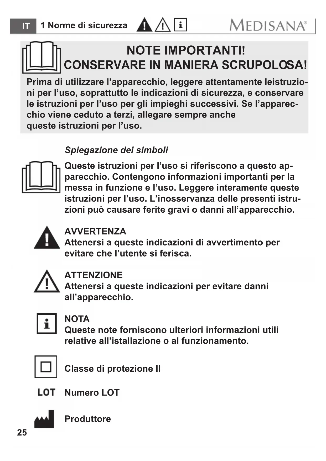 - I prodotti MEDISANA hanno una garanzia di tre anni a partire dalla data di vendita. La data di acquisto deve essere comprovata in caso di garanzia dalla ricevuta di acquisto o dalla fattura.