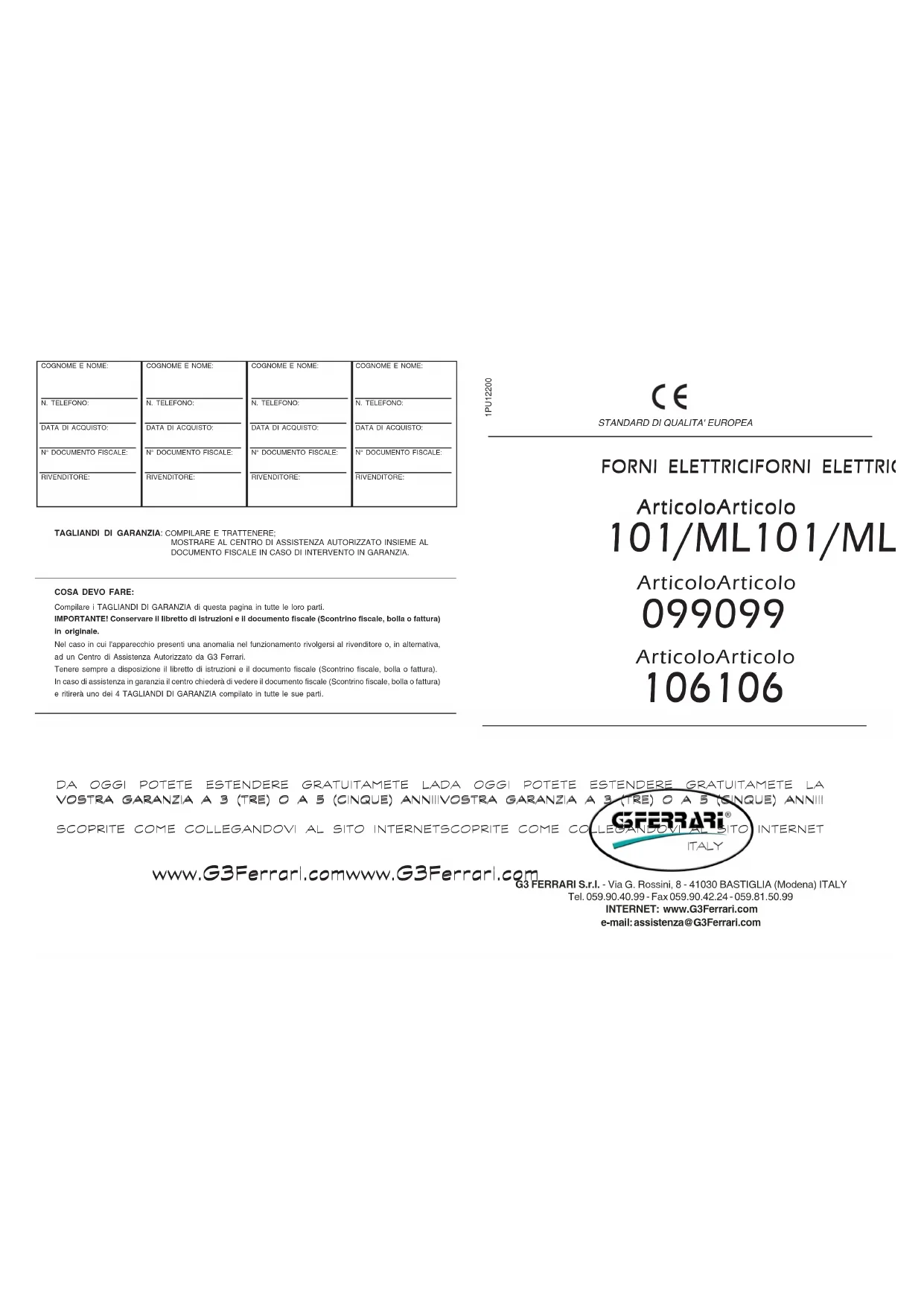L'apparechio delve essere riparato esquisvimente da personale autorizzato da G3 FERRARI; l'eventuale manomissione da parte di personale non autorizzato fara docadora la GARANZIA. Le riparazioni vongono effettuale gratuamente presso G3 Ferrari o presso uno dei Centri di Assistenza Tecnica autorizzati da G3 Ferrari. Qualora dovesse manifestarsi un difietto di conformità nel prodotto G3 Ferrari after il sesto mese alla segna, l'utente finale che puso usfurente della garanzia ai sensi del sudetto D.Lgs. dovra rivolgersi al rivendatore o, in alternatively, ad un Centro di Assistenza Autorizzato da G3 Ferrari agliagda la seguente documentazione: